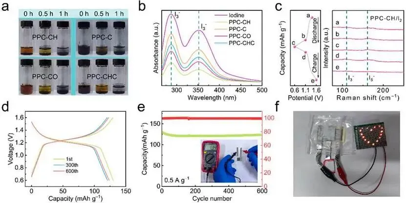 综上所述,本研究以可再生花生壳为碳前驱体,系统考察了四种弱碱性钾盐(KHCO₃、K₂CO₃、K₂C₂O₄·H₂O及CH₃COOK)作为活化剂所制备多孔碳材料的理化特性,并全面评估其在锌碘(Zn–I₂)电池正极中的电化学性能。结果表明,KHCO₃活化所得PPC–CH材料兼具高度有序的致密堆叠层状形貌、高微孔率(72.3%)与适中石墨化程度(ID/IG = 2.85),不仅为碘单质及多碘化物提供了充足的限域吸附位点,更通过优化电子传导通路与离子扩散通道,显著促进I₂/I⁻氧化还原反应的动力学进程。基于PPC–CH/I₂正极构建的Zn–I₂电池展现出卓越的循环稳定性与工程级长寿命特征:在2 A g⁻¹高倍率下持续运行9000次后,放电比容量仍稳定维持在99.9 mAh g⁻¹,容量保持率达88.2%;进一步集成的软包电池(正极碘负载量3.2 mg cm⁻²,电解液用量15 μL cm⁻²)在0.5 A g⁻¹下完成600次循环后,放电比容量保持123.7 mAh g⁻¹,平均库仑效率高于99.3%。该工作证实,弱碱性钾盐活化生物质碳是一种兼具科学合理性与工艺可行性的先进策略,为发展高能量密度、长日历寿命及可规模化制造的实用化Zn–I₂电池提供了切实可靠的材料体系与技术支撑。