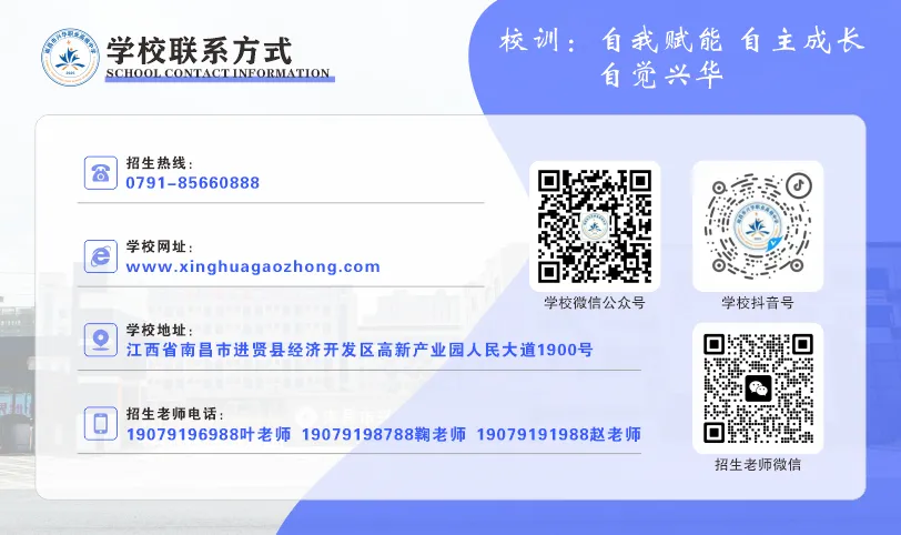 南昌市兴华职业高级中学是一所经南昌市教育局批准设立的全日制、寄宿式、全封闭管理的现代化职业高级中学。学校位于江西省南昌市进贤县经济开发区高新产业园人民大道1900号,人民大道与凤岭路交汇处,临近进贤县人民政府府地。校园占地面积40000平方米,建筑面积27219平方米。学校拥有现代化的教学大楼、设备先进的专业实训大楼、舒适整洁的学生公寓、图书馆、云机房、全新的塑胶运动场、篮球场等配套设施一应俱全。学校师资力量雄厚,配备有经验丰富的文化课教师,以及由合作企业选派行业专家、技术骨干担任专业课教学。学校开设有普职融通高考班、艺术高考班、职教高考班和工业机器人技术应用、新能源汽车制造与检测、美容美体艺术和艺术设计与制作四个专业。真正做到兴华职高、班班有特色,人人有特长。使每一位学生升学有优势、就业有能力,发展有通道。