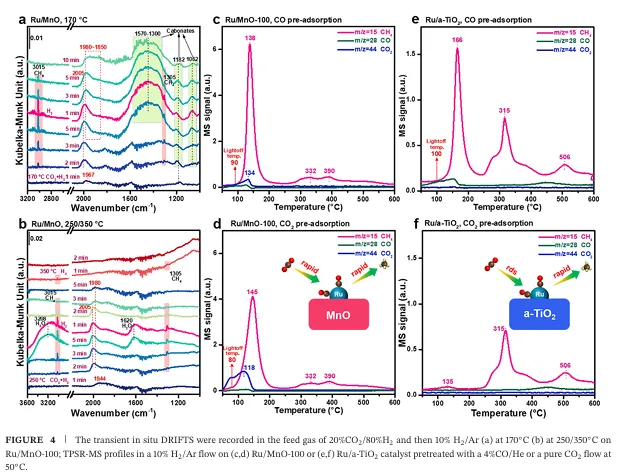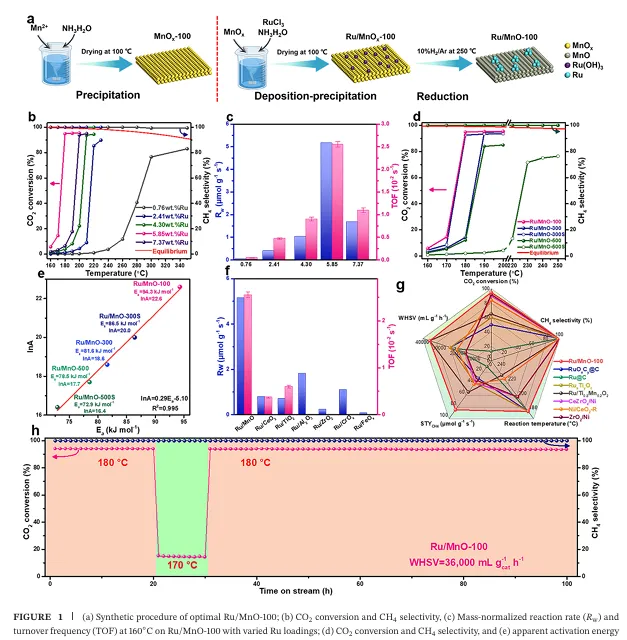 低温高效催化性能:通过优化Ru负载量和催化剂制备条件,本研究实现了Ru/MnO催化剂在低温(180°C)下的高效催化性能,CO₂转化率和甲烷生成速率均达到国际领先水平。这一成果不仅解决了低温CO₂加氢反应动力学缓慢的问题,还降低了反应能耗,提高了过程经济性。