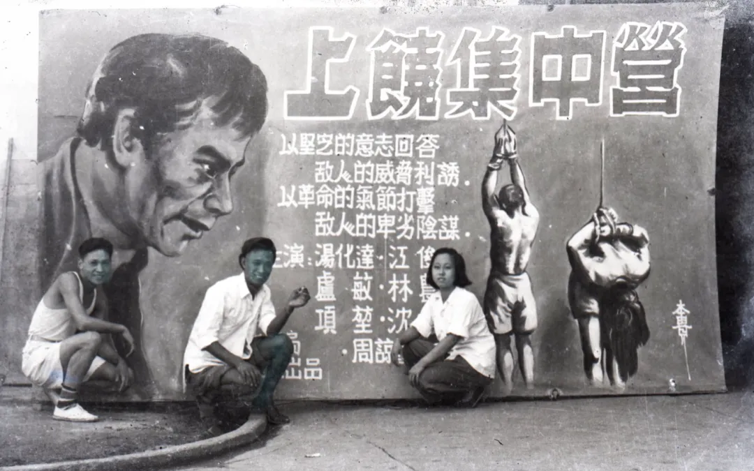 1951年黄本贵(左)在绘制的《上饶集中营》电影海报前