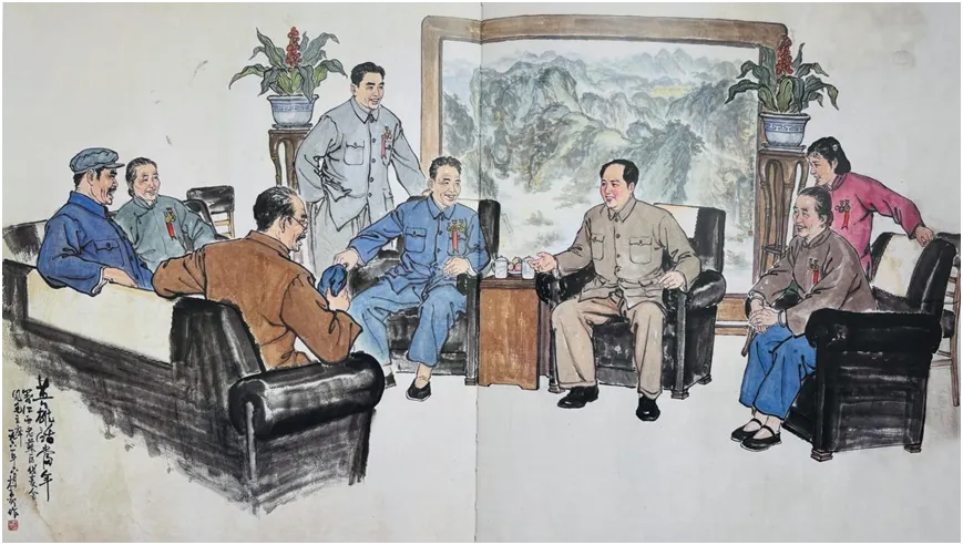 释文:英雄话当年。毛主席会见江西老苏区代表。一九六一年六月,本贵作。