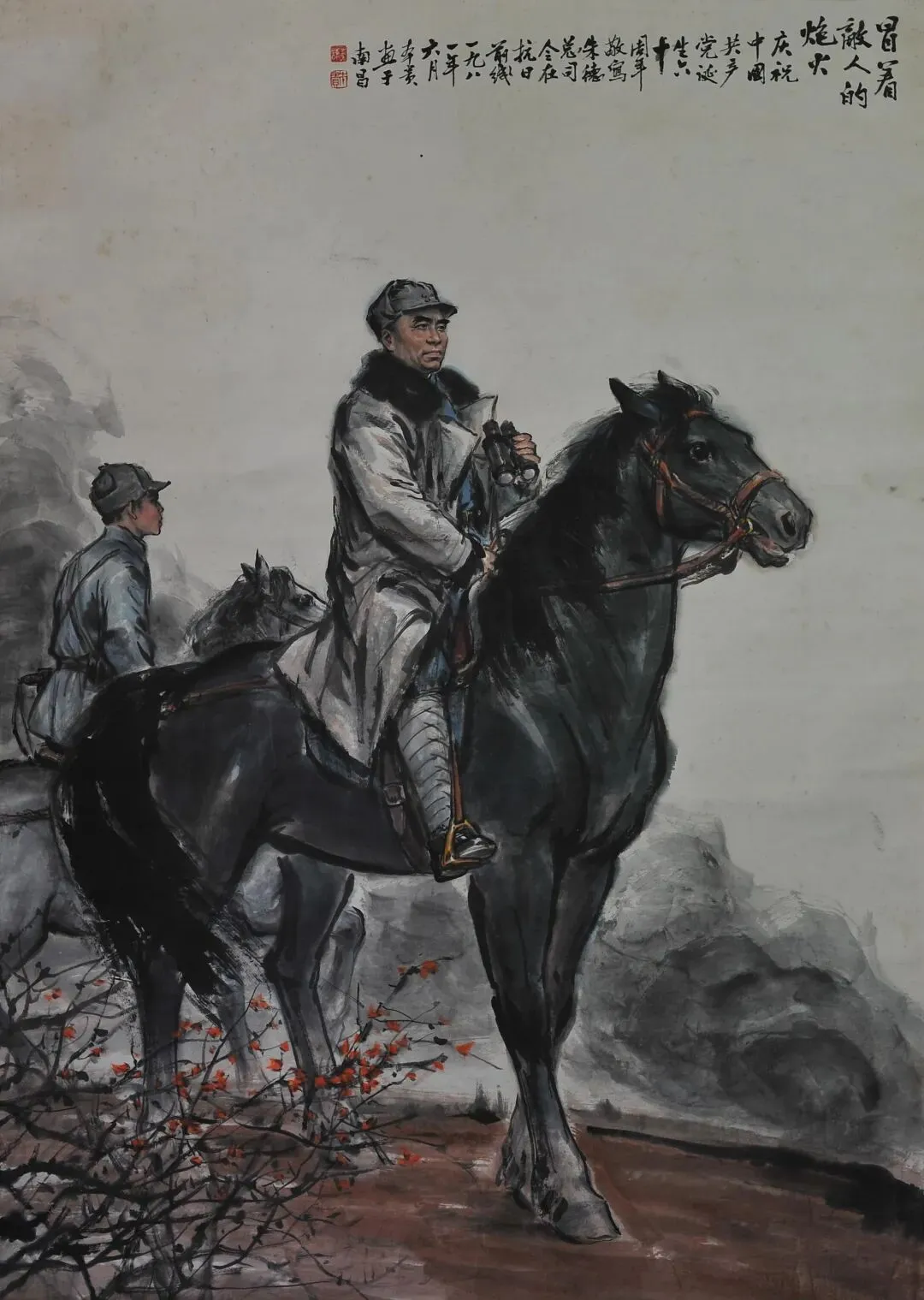 释文:冒着敌人的炮火。庆祝中国共产党诞生六十周年,敬写朱德总司令在抗日前线。一九八一年六月,本贵画于南昌