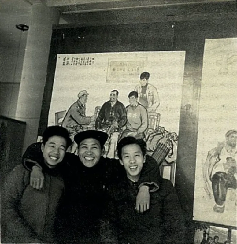 1964年黄本贵与朋友在全国美展参展作品《贫农探亲》前
