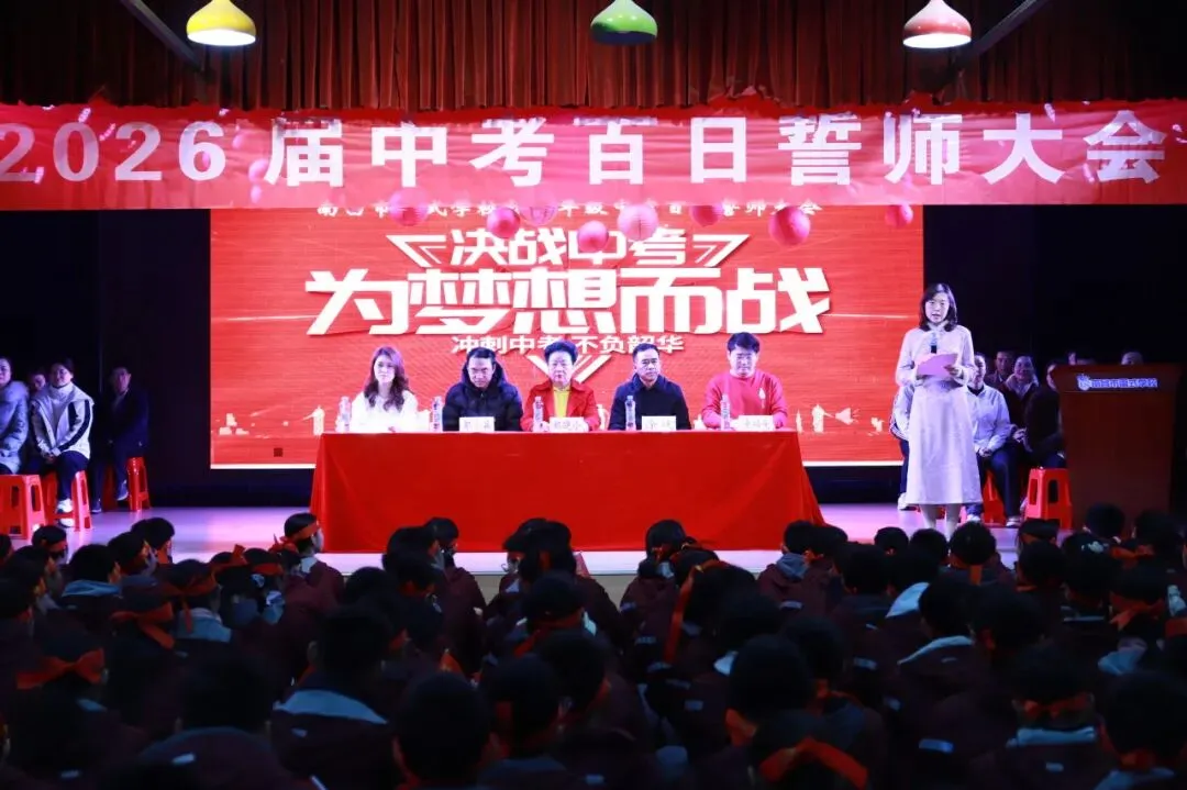 春风擂战鼓,百日铸辉煌!3月8日上午,南昌市雷式学校2026届中考百日誓师大会在爱乐楼隆重举行。学校副校长涂斌、邹小兵,年级主任涂福亮、田倩云,以及各处室主任和全体初三师生、家长代表齐聚一堂,为中考奏响进军号,为梦想奋力一搏。大会由李星桦老师主持。