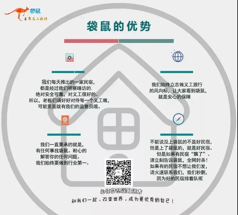 “袋鼠青年义工旅行”是一家专门服务于青年的活动信息平台。主要提供青旅客栈义工.志愿者活动.赛事活动.夏冬夏令营招募活动及其袋鼠自制的活动等信息,整合所有大学生旅行资源。经我们发布的信息,每一个都经过严格仔细筛选,安全可靠。敬请期待,我们的自制活动!