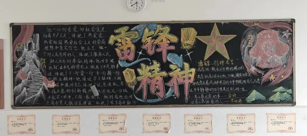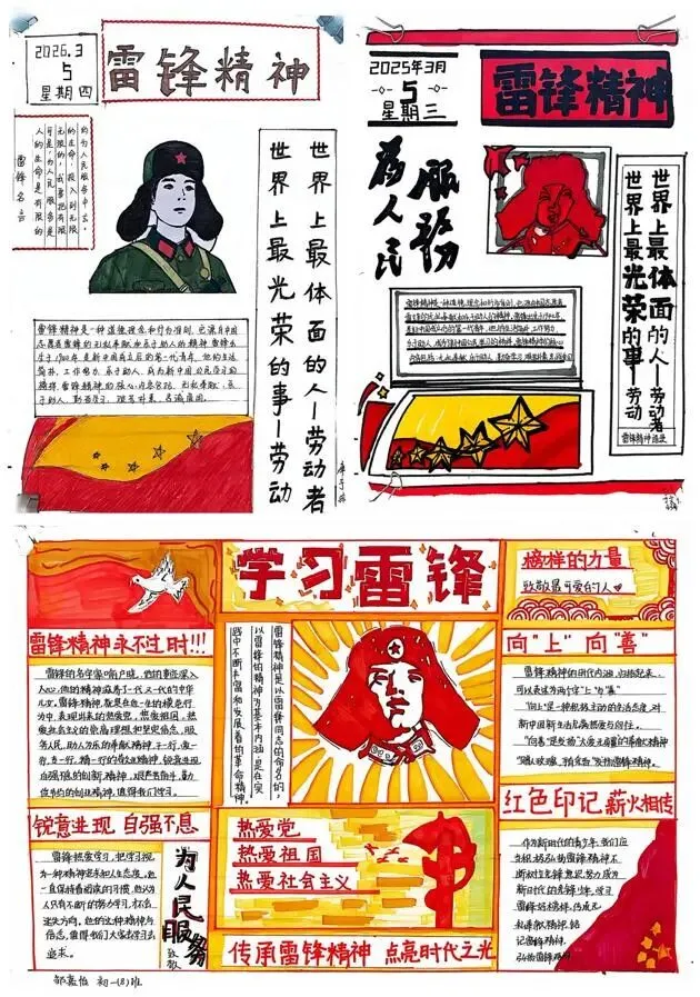 在天佑路校区,“雷锋印象”主题手抄报展示活动吸引了众多学生参与,一幅幅精美的作品描绘出同学们心中雷锋的形象,也书写着他们对奉献精神的理解。