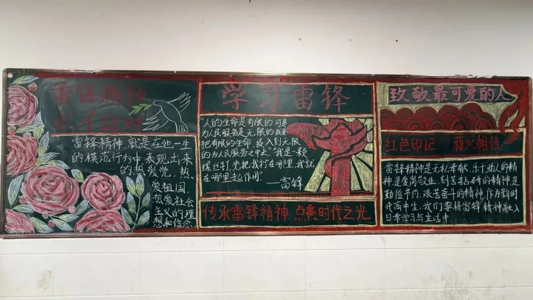 同时,四校区校内洋溢着学雷锋的浓厚氛围。政教处充分发挥育人职能,在洛阳路校区和九龙湖校区同步组织学雷锋主题黑板报评比活动,各班精心设计版面,用粉笔勾勒对雷锋同志的敬意。