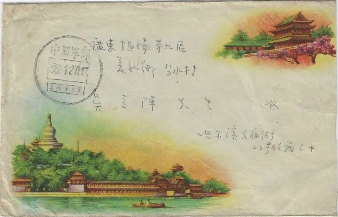 如图所示,为1956年从哈尔滨文庙街23号信箱寄揭阳第九区美和乡汾水村的军邮信件,销1956年11月27日圆形军邮戳,背后有12月4日“广东揭阳 汾水”民国沿用三格式点线戳。