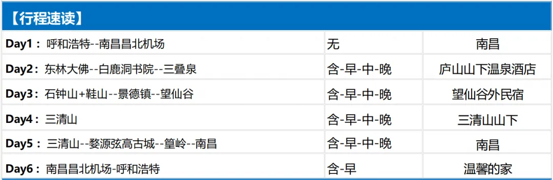 参考航班:南昌-呼和 HU7311(12:55-15:40)【成人费用】报价含行程所列项目综合打包费用,优惠证件不再享受减免【儿童费用】儿童费只含车导费、半餐费、不占床位,门票自理【住宿】全程 5 晚酒店住宿,若出现单人或单男单女时,需补房差元/人,如酒店有三人房或加床,则不需补房差。【门票】行程所列景区首道大门票;(自理项目除外)、赠送景点不去不退且任何证件不享受优惠。【用餐】5 早 8 正餐(正餐 30 元/人正,10 人一桌 8 菜 1 汤,若人数不足 10 人,则减少菜的数量或调整菜单;如不用餐餐费不退)如成团人数不足 8 人餐费退还客人不做团餐;如因游客原因不吃团餐不退餐费。(如不用餐餐费不退,婺源三清山酒店均为用晚餐送早餐,如不在酒店吃晚餐则早餐自理)【交通】空调旅游大巴;客运资质齐全,确保一人一正座。【导游】专职持有国家导游资格证 3 年以上导游;带队讲解服务。1、除行程所列提供项目之外的其他消费,个人购物消费等。