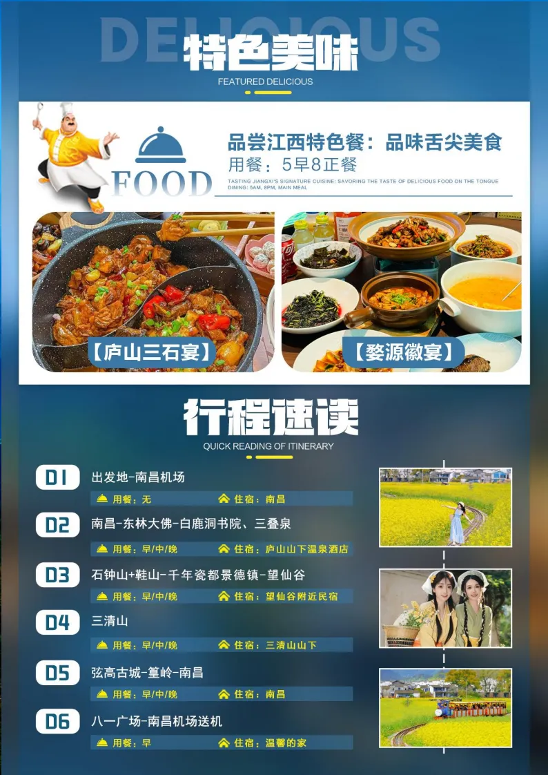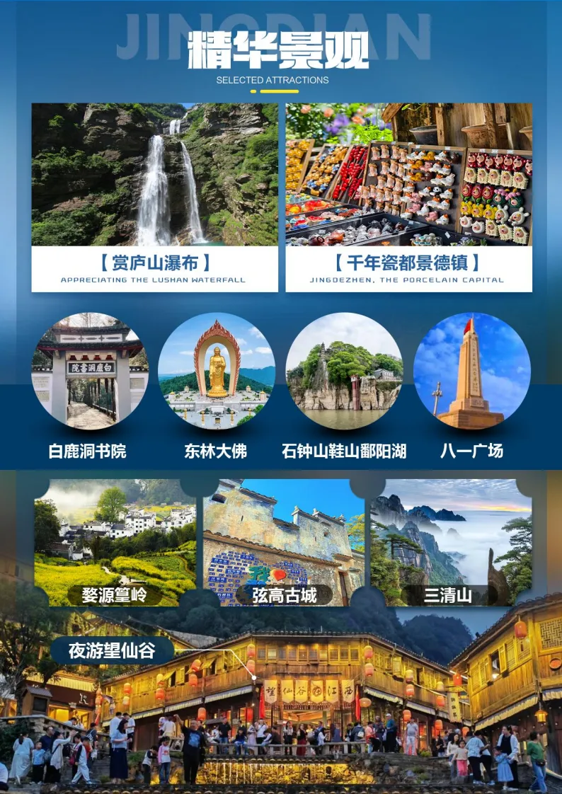 游览中国古代四大书院之首——【白鹿洞书院】位于江西庐山五老峰南麓,与湖南长沙的岳麓书院、河南商丘的应天书院、河南登封的嵩阳书院,合称为"中国四大书院"。相传书院的创始人可以追溯到南唐的李渤。李渤养有一只白鹿,终日相随,故人称白鹿先生。后来李渤就任江州(今九江)刺史,旧地重游,于此修建亭台楼阁,疏引山泉,种植花木,成为一处游览胜地。由于这里山峰回合,形如一洞,故取名为白鹿洞。游览【三叠泉瀑布】(不含电瓶车 20 元/人)位于庐山东南九叠谷,是国家 AAAAA 级旅游景区。集险峰怪石、飞瀑流泉为一体的山丘型旅游圣地。古人称“匡庐瀑布,首推三叠”,誉为“庐山第一奇观”,瀑布由大月山、五老峰的涧水汇合,从大月山流出,经过五老峰背,由北崖悬口注入大盘石上,又飞泻到二级大盘石,再喷洒至三级盘石,形成三叠。古人描绘曰:上级如飘云拖练,中级如碎石摧冰,下级如玉龙走潭。势如奔马,声若洪钟,总落差155 米。仰看瀑布尤为壮观,自成美趣,故有“不到三叠泉,不算庐山客”之说。DAY3温泉镇--石钟山+鞋山--景德镇--望仙谷早餐后,车赴【石钟山】(车程约70分钟),中国第一大淡水湖鄱阳湖(自理石钟山+鞋山+鄱阳湖游船 110元/人),游千古奇音第一山【石钟山】滨临鄱阳湖,屹立于鄱阳湖入长江的交汇口,扼江控湖,有“江湖锁钥”之称,历来为兵家必争之地。周瑜、朱元璋、太平军乃至近代李烈钧都在此有过战迹;宋代诗人苏东坡泛舟实地考察后写下《石钟山记》,更使石钟山名扬天下。中餐独家赠送享用鄱阳湖最具特色的饕餮盛宴——“鄱阳湖鱼宴”(所用食材全部由鄱阳湖所产淡水鱼类制作而成,尽显江南鱼米之乡的饮食风情)。游鄱阳湖冬季候鸟的栖息地和观赏区【鞋山岛】,景区素有“天下无双第一鞋,享有世界文化景观之美誉”。位于中国最大的淡水湖鄱阳湖中段,孤峰独特、雄踞中流,威镇鄱湖,以神奇峻拔,物华灵秀著称于世,是鄱阳湖中的第一绝景。后可乘船游览鄱阳湖和长江交汇处形成的天然绝景【江湖两色】,江水西来浑浊,湖水南来清澈,在千古名山石钟山下形成一条延绵 50余里的清浊分界线,吸引了众多游客前来观赏。车赴中国瓷都—【景德镇】(车程约2小时),景德镇是游客必打卡之地,古色古香的徽派建筑,现代风格的陶吧酒吧,高耸入云的窑囱,墙壁上保留着各个时代的标语,相映成趣。游览【景德镇市雕塑瓷厂】,雕塑瓷厂创建于 1956年,为国家二级企业,国家旅游局等部委指定的全国旅游商品定点生产企业和国家环保局评定的全国环保先进企业。该厂产品以陶瓷雕塑为主,辅之以园艺瓷、陈设瓷、工业模具瓷等,同时还承接城市雕塑、园林雕塑、建筑雕塑。走近景德镇市雕塑瓷厂,错落有致的厂房,古色古香的徽派建筑,现代风格的陶吧酒吧,高耸入云的窑囱,墙壁上保留着各个时代的标语,相映成趣;厂区内穿着工服的瓷工与打扮时尚前卫的参观者川流不息。这里,历史与现实、工业与艺术和谐地交融在一起,成为景德镇陶瓷文化创意产业的一个新地。后车赴【望仙谷】(车程约 3 小时),【夜游望仙谷】,是从悬崖顶上朝鹤楼的灯光闪烁开始。”“望仙谷的灯光秀不同别处,自带玉宇琼楼的仙气。仰望白鹤崖,从朝鹤楼上喷薄而出的光柱,冲破雨雾,散发光芒。丝丝光柱,缕缕如烟,似箭,似柱,指向夜空。朝鹤楼的灯光秀,也不总是保持一种姿态。她时而直射,时而平扫,变换不同身姿,也变换不同色彩,多彩的灯光,轻抚山岚,时而如彩带,时而如秀发,飘飞仙谷,轻抚楼宇,绕过山涧,拥抱林木,最后将七彩余光照进瀑布,融入溪流,幻影成仙”。夜幕下的望仙谷灯火通明,从高处俯瞰,整个山谷流光溢彩,灯光亮起的一瞬间,一整个惊艳住,悬崖边的房子和夜晚灯火通明的夜景集市,仿佛一下带您进了动画里的世界。这里的民俗文化丰富多彩,桥灯、庙会、傩舞、板龙灯,稻米习俗.......人文风情引人注目。夜幕低垂,华灯初上,浪漫的气息笼罩着整个山谷,隐世悬崖之上的灯火阑珊,山林溪水相伴,享受仙谷夜色★望仙谷篝火会晚上 20:00 开始,火舞+篝火演出互动+蹦迪+歌曲互动(雨雪天气取消篝火晚会具体开场时间以景区安排为准)入住景区外民宿。早餐后车赴【三清山】(车程约 1.5 小时)、自费索道上山(自理往返索道 125 元/人,节假日人多,因此导游会安排早点出发,早餐有可能会打包,购票后不得退票),三清山位于中国江西省上饶市玉山县与上饶德兴市交界处,为怀玉山脉主峰。因玉京、玉虚、玉华“三峰峻拔、如三清列坐其巅”而得其名,三峰中以玉京峰为最高,海拔 1819.9 米,是江西第五高峰,也是信江的源头。三清山是道教名山,风景秀丽,被誉为中国最秀丽的山峰。参观【阳光海岸景区、南清园景区】赏三清山绝景:东方女神、巨蟒出山、巨蟒栈道,站在栈道上俯瞰大峡谷,也是一种难得的体验。漫步于阳光海岸之上,脚踏浮云,身披雾纱,犹如遨游于仙境之间。放眼望去,远处奇峰怪石、高山石林等壮丽景观尽收眼底,是观赏三清山东部瑰丽风光的最佳之处。结束后入住酒店!早餐后车赴婺源(车程约 2 小时),游览婺源新地标【弦高古城】,弦高古城宛如一颗璀璨的明珠,在婺源这片土地上绽放着独特的光芒,让人仿佛穿越时空,领略到千年徽州的风华韵味。踏入弦高古城,仿佛走进了一幅精美的徽派画卷。这里的每一块青砖黛瓦、每一处飞檐翘角,
