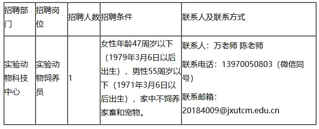 声明:本微信公众号刊载此文,无任何商业目的,纯属公益转发,目的是架起求职者和用人单位之间的桥梁,传递更多的招聘就业信息,请您找工作时候务必高度警惕各类求职陷阱。若来源标注错误或侵犯了您的合法权益,请及时与我们联系,我们将及时更正、删除或依法处理,微信号(含:商务合作):sqdzry。因工作需要,江西中医药大学实验动物科技中心公开招聘实验动物饲养员1名,具体条件如下: