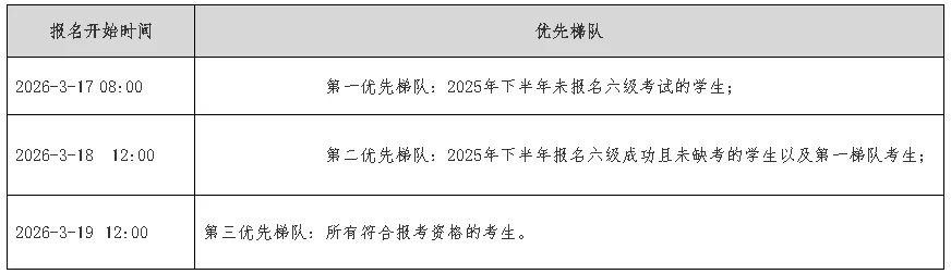 2.大学英语六级各优先梯队报名开始时间(大学英语四级报名不作限制):