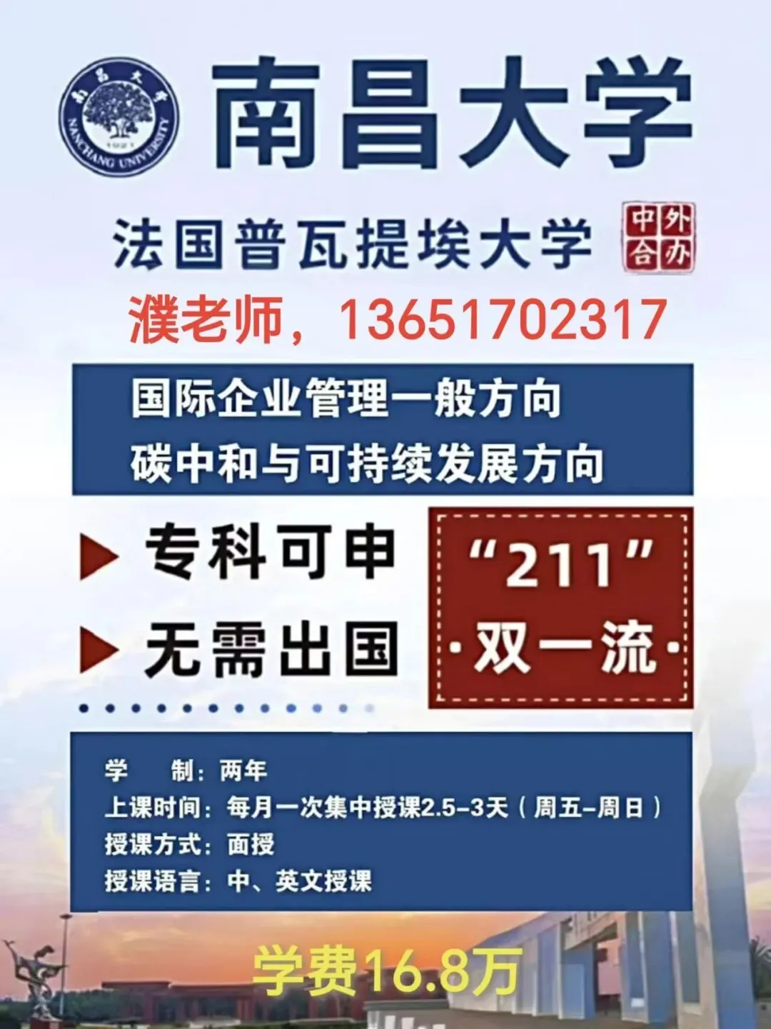 【学校】:2026级南昌大学-法国普瓦提埃大学合作办学硕士免全国联考留服认证国际企业管理硕士