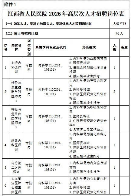 领军人才、学科方向带头人、学科优秀人才等招聘人数不限,博士等招聘计划共76名,具体招聘岗位及要求详见《江西省人民医院2026年高层次人才招聘岗位表》(附件1,以下简称《岗位表》)。