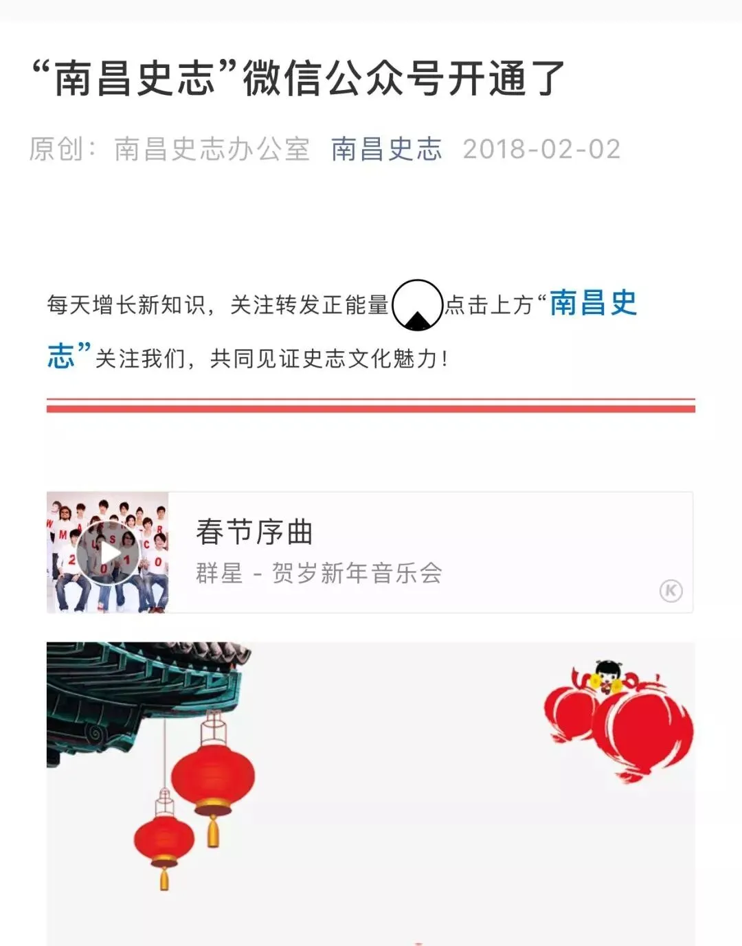 2018年2月2日,开通“南昌史志”微信公众号,以“存史、资政、育人,传承和弘扬天下英雄城南昌史志文化”为宗旨,借助新媒体向公众和社会宣传南昌历史,讲好红色故事,传播史志正能量。全年共发布文章83篇,其中党史文章50篇,方志文章24篇,工作动态9篇。先后推出工作动态、人物春秋、党史传奇、红土纪事、南昌风俗、志说南昌和理论纵横等栏目,以庆祝改革开放40周年为契机,推出“史志君带你看”专栏,其中《英雄城的网红地标——八一广场的前世今生》《改革开放40年英雄城南昌“长胖”了》《“数说”改革开放40年南昌商业巨变》《从昔日滩涂到“南昌浦东”红谷滩十八年“蝶变”》等原创文章分别被南昌日报社、江西晨报和“文明南昌”刊载转发,影响力逐步扩大。