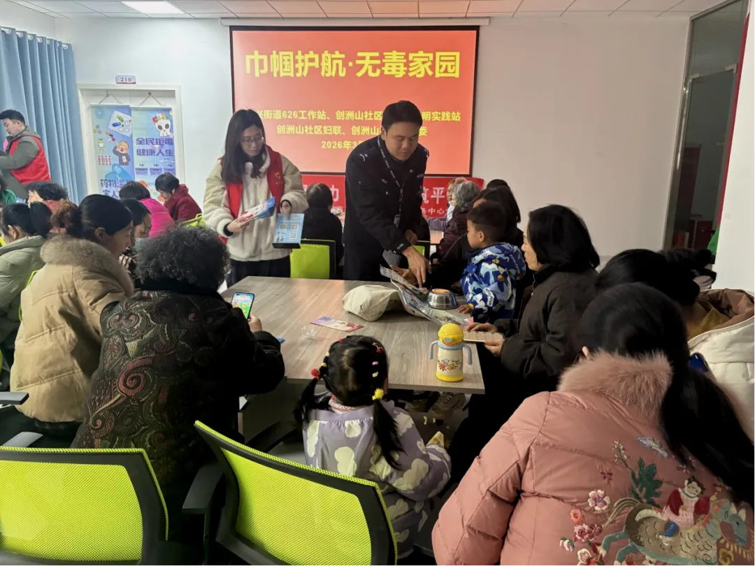 红谷滩区龙兴街道6.26工作站联合龙兴街道派出所、龙兴街道创洲山社区在创洲山党群活动中心开展禁毒普法宣传活动