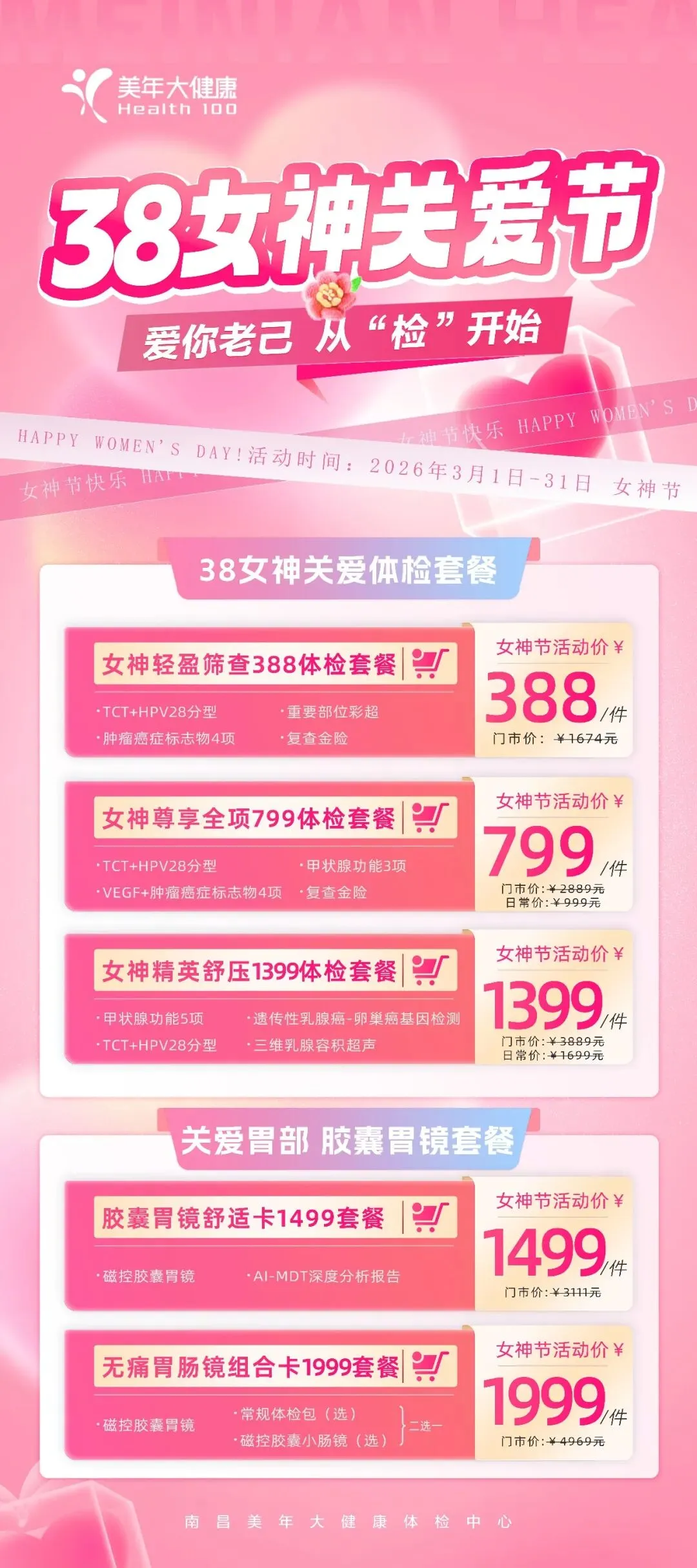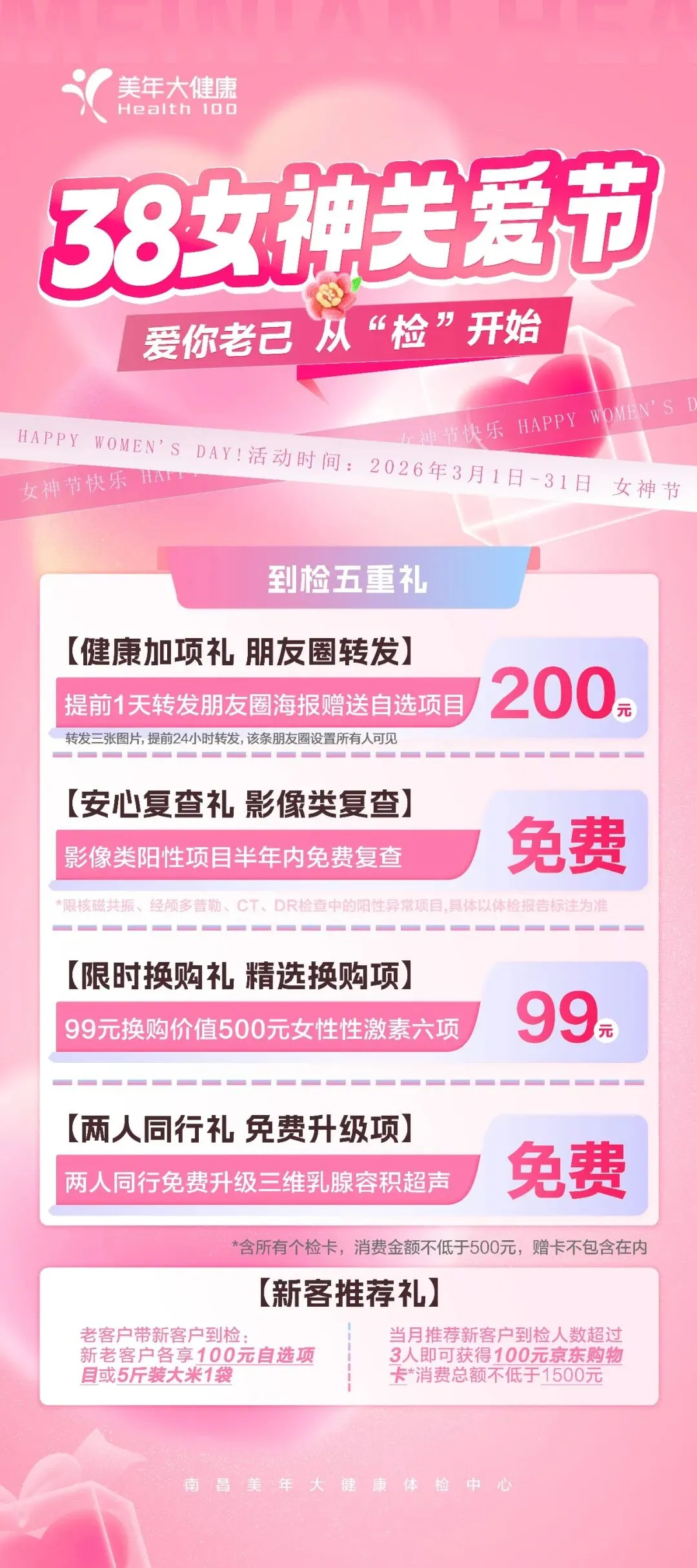 春风拂暖,万物生辉,在这个致敬女性、歌颂美好的三月,我们迎来了“三八”国际妇女节。每一位女性,都是生活中的守护者、职场上的奋斗者,更是自己人生的主角。忙碌之余,她们常常忽略了自身健康,而这份被忽略的美好,正是美年大健康南昌公司始终牵挂的初心。