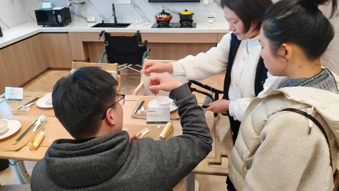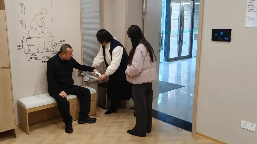 首先映入眼帘的是经过精细化设计的入户空间。缓坡处理、加宽的门框、稳固的扶手与换鞋凳一体化设计,从第一步就确保了安全与便利。南昌团队的工程师们格外关注通道宽度、回转半径等数据,频频点头,并与我中心技术人员就公共建筑门厅的无障碍转化可行性进行了现场探讨。