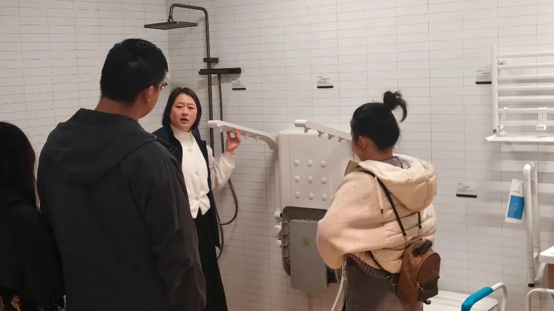 在卫浴空间,来宾们产生了极大的兴趣。可升降的洗脸台盆、步入式防滑浴缸、配合墙装扶手的坐式淋浴器,以及智能马桶旁的紧急呼叫拉绳,每一个细节都旨在消除老年人洗漱如厕的风险。