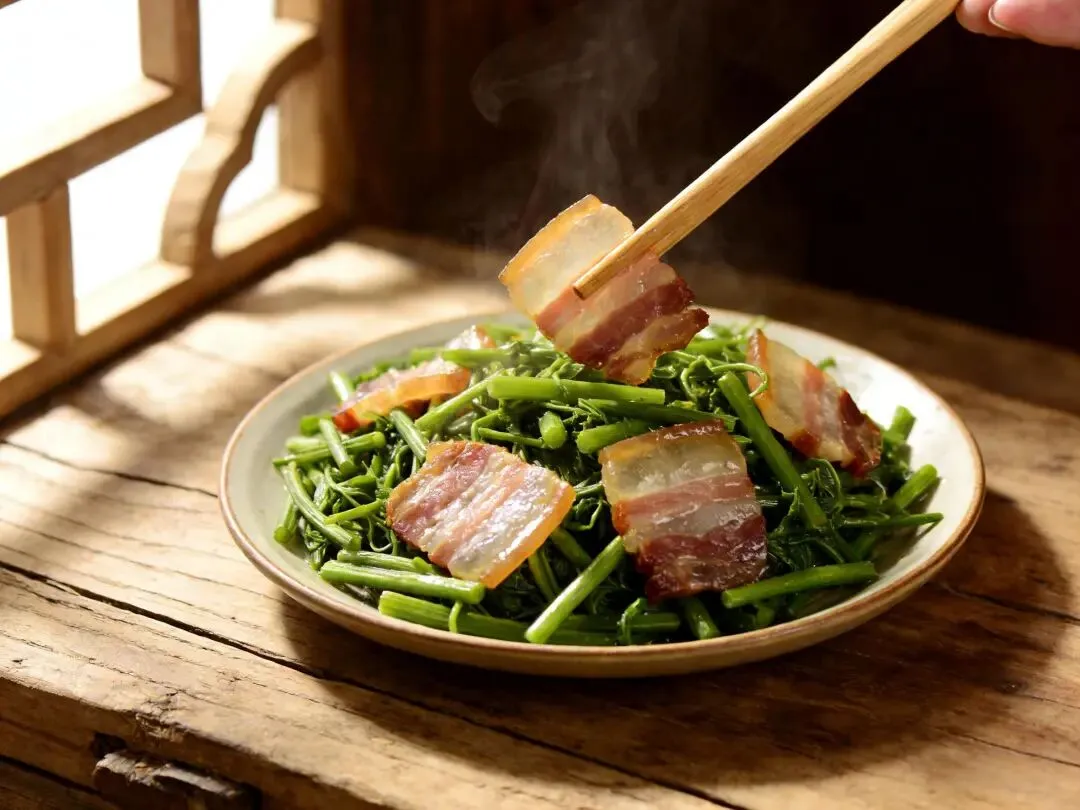 我真的买了一把。真的找了馆子。那盘藜蒿炒腊肉上桌的时候,腊肉的油光裹着藜蒿的青翠,香得我差点把舌头咽下去。