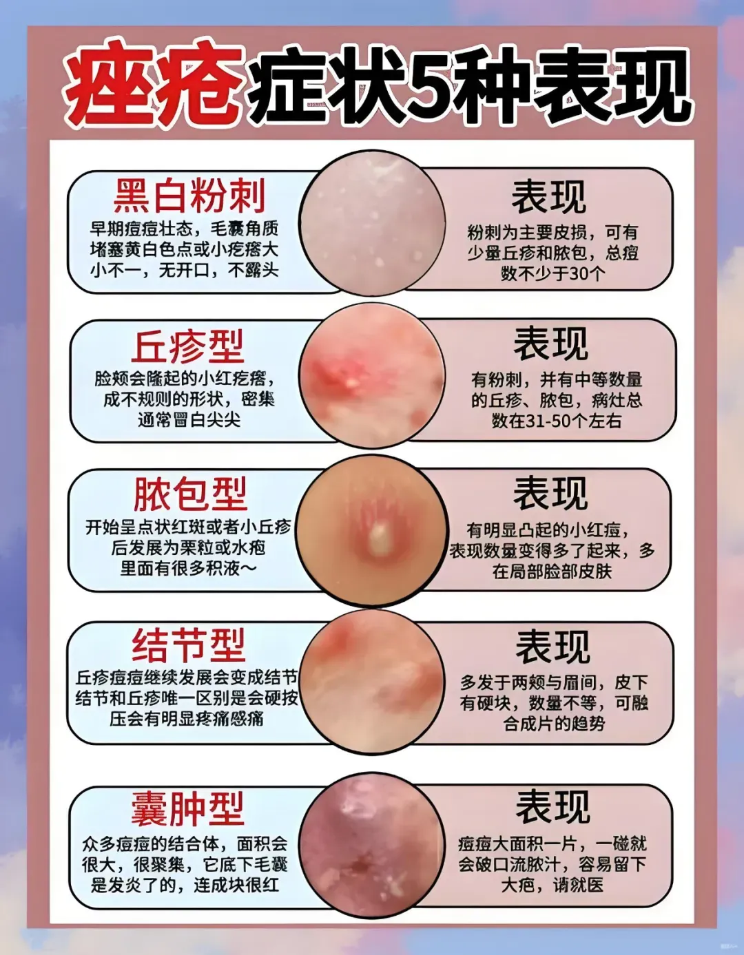 痤疮是毛囊皮脂腺发炎引起的问题,模样不止一种: