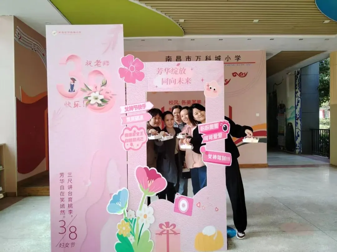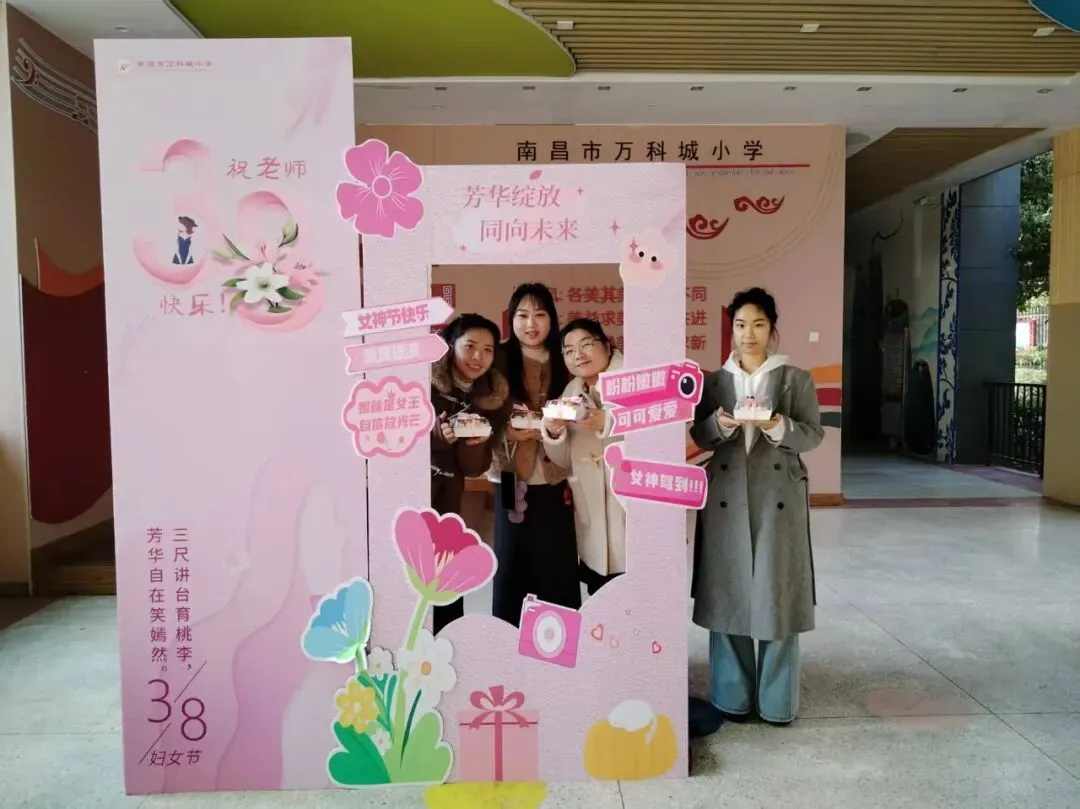 3月6日清晨,温馨的KT版背景墙早已布置完毕。老师们驻足合影留念,定格美好瞬间,同时收获来自学校的暖心祝福与精致小蛋糕。甜在心头,暖在校园,每一位女教师都在平凡岗位上,书写着不凡的温柔与力量。