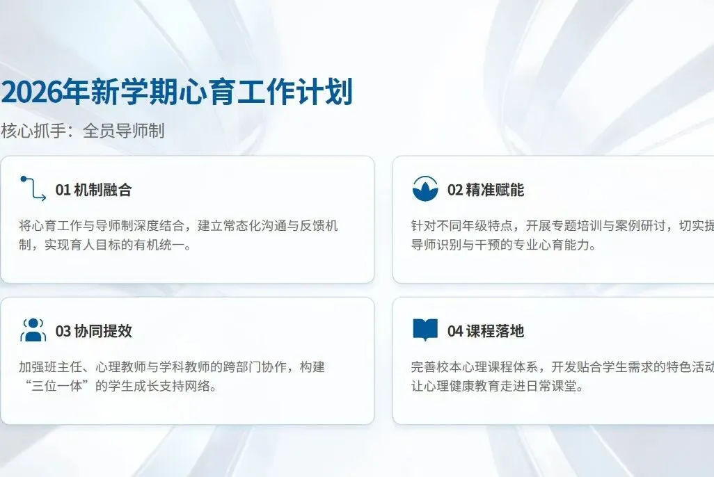 心理室任婧老师对上学期心理健康教育工作进行了全面复盘总结。她指出,学校已顺利完成全体在校生心理测评及数据平台规范录入,实现学生心理状况筛查全覆盖。通过深化“悦心”心育品牌建设并开展系列活动,有效营造了积极健康的校园心理氛围;同时完善“三包”包保机制,构建起“全员参与、全程跟踪、全方位覆盖”的育人格局。针对新学期工作,任婧表示将聚焦机制融合、精准赋能、协同提效、课程落地四大方向,全力推动“一生一档一导师”精准帮扶模式落地生根,切实提升心育工作的针对性与实效性。
