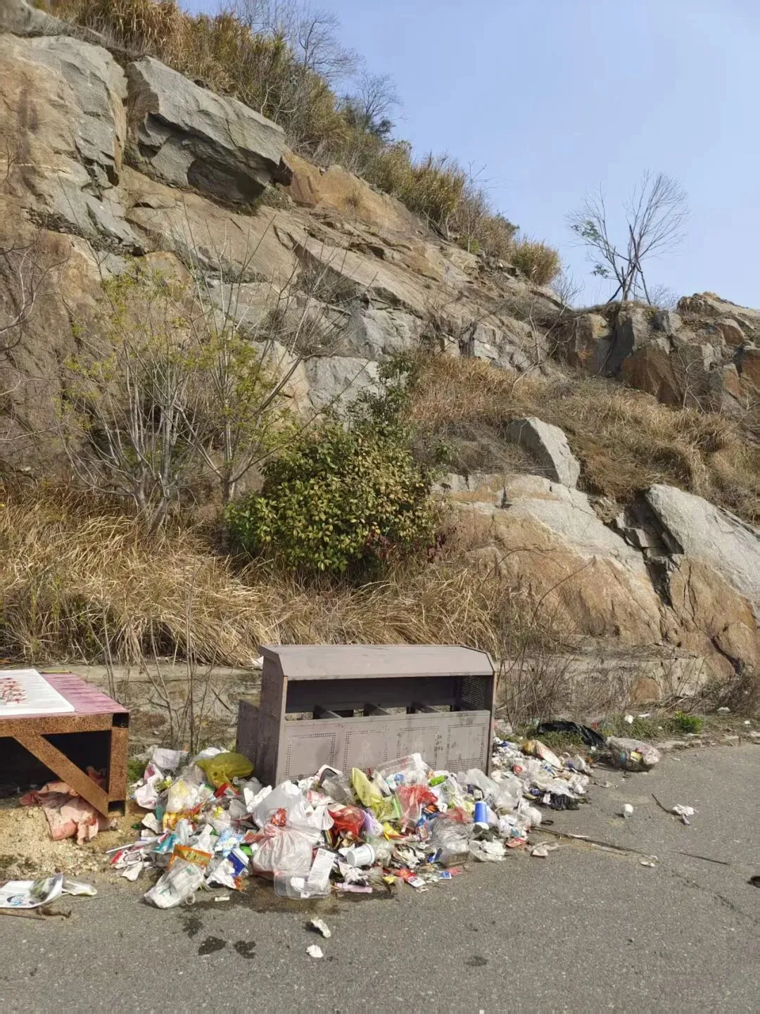 随着梅岭索道的修建,矿坑公园这边的人流量也越来越大,从垃圾的多少就可以看出来。这边也有摆放了几个垃圾分类的垃圾桶,但是常年无人清理,垃圾均堆放在垃圾桶外面经过长时间的风吹雨打,已经开始发酵腐烂,好多都是打包到一起的食物残渣,果皮等。