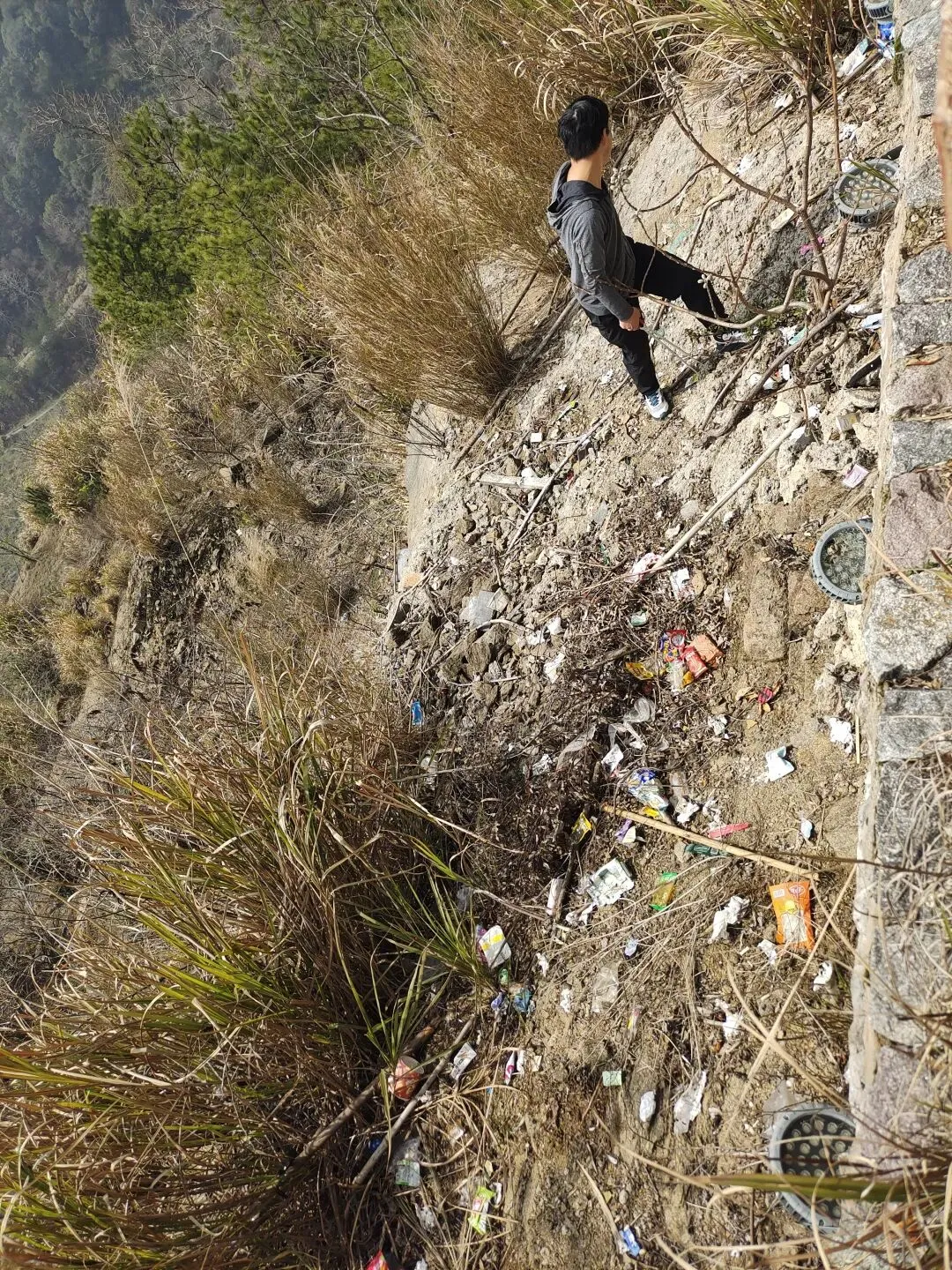 栖凤台栏杆外面也到处都是垃圾,一些游客拆了食品包装以后就随手扔到山下去了,温老师翻出栏杆去下面捡:路两边垃圾遍地