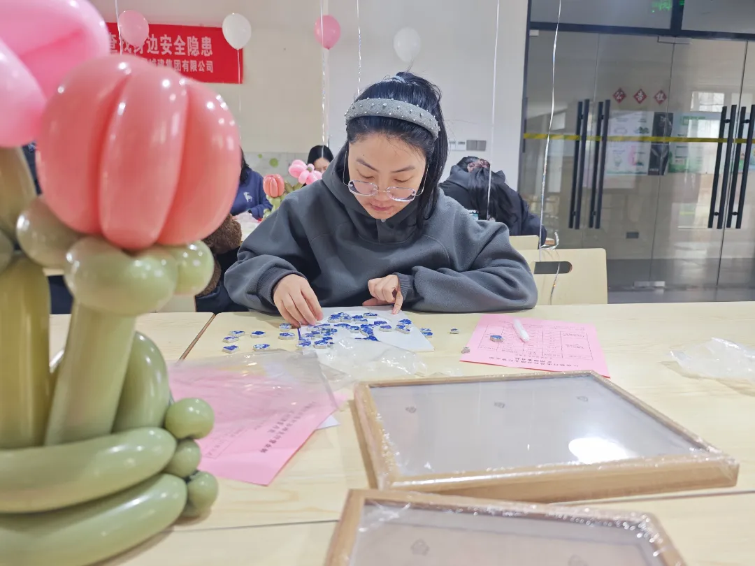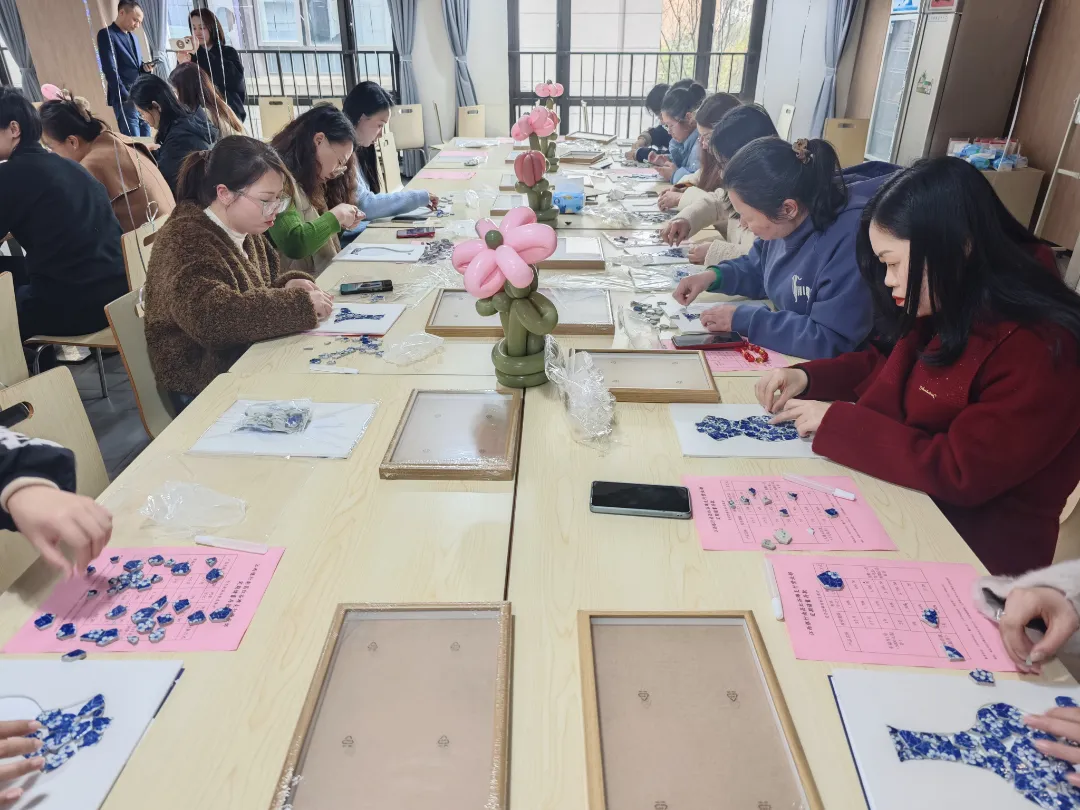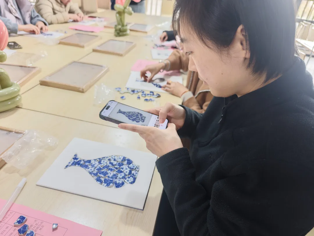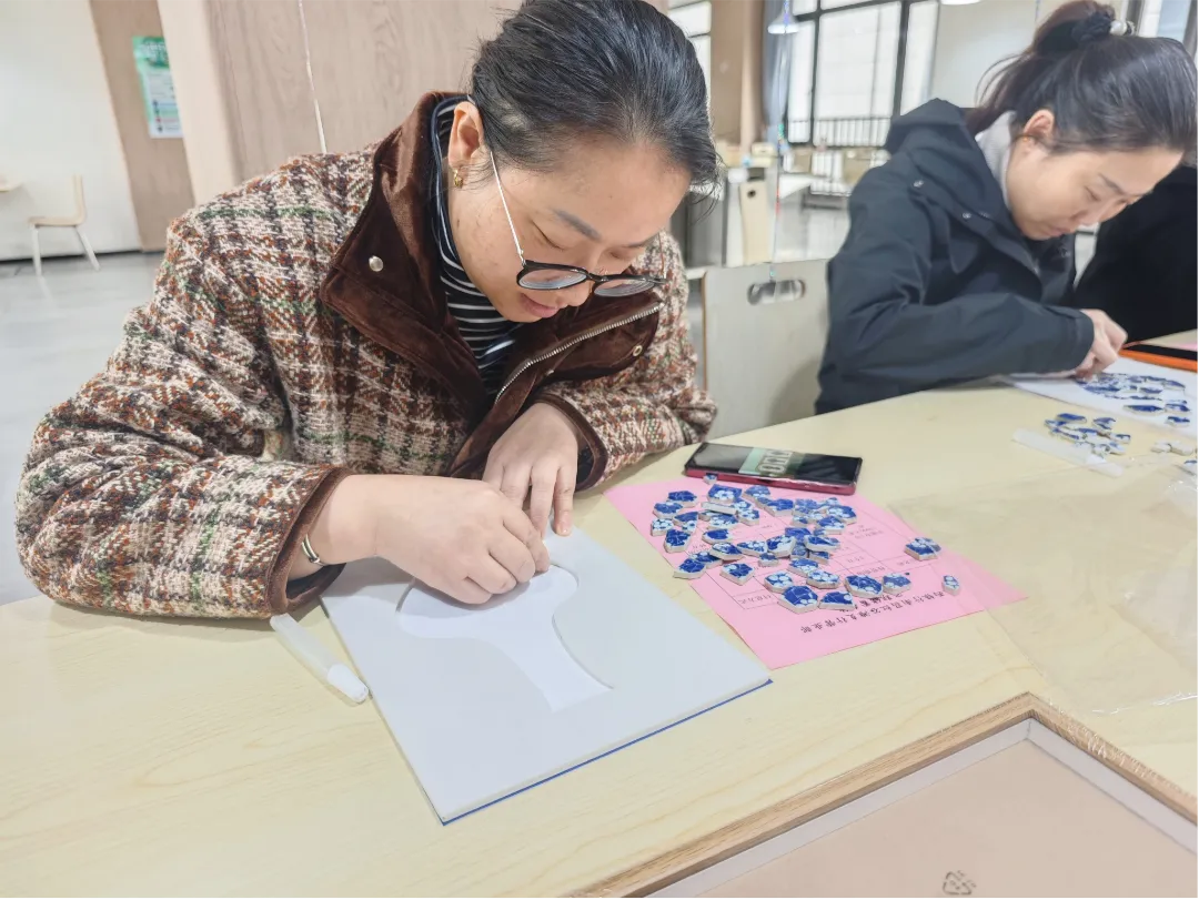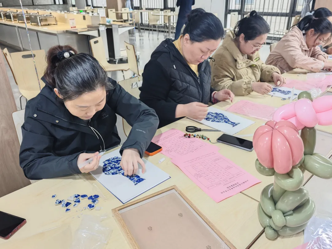 活动现场,青花瓷片、木质底板、环保胶水及装饰配件整齐陈列,素雅清丽,古意盎然。下午14点30分,活动准时开始,在专业老师细致讲解下,大家了解了青花瓷的文化意蕴与拼贴创作技巧,并在示范引导下开启创意之旅。女职工们精心挑选瓷片,巧手拼贴,或复刻传统纹样,或自由组合抽象图案,将碎瓷“化零为整”,让残缺重焕新生——每一件作品都凝聚着专注、耐心与对美的独特理解。