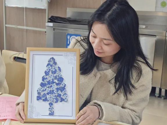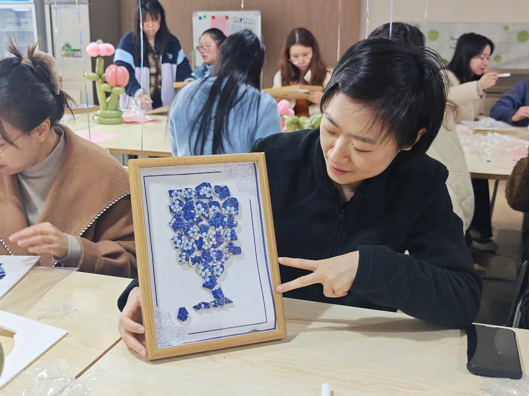 创作过程中,大家沉浸于指尖艺术的宁静与专注,现场不时传来轻声交流与会心笑声,氛围温馨而松弛。一块块碎瓷在巧思中重获新生,一幅幅作品在静谧中悄然绽放,不仅舒缓了平日工作的紧张节奏,更带来满满的成就感与愉悦感。作品完成后,大家踊跃分享创作灵感,彼此欣赏、真诚点赞,并在欢声笑语中合影留念,定格下这个充满诗意与温情的节日午后。