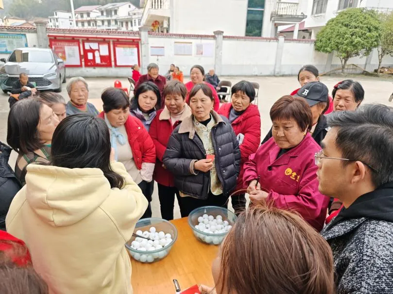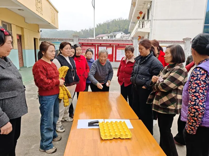 紧接着进行的“福气投投乐”同样人气高涨。游戏规则简单有趣:将乒乓球投入特制的蛋托内,即可根据投中数量获得相应的新鲜鸡蛋。大家排起长队,轮番上阵,有的稳扎稳打,连中三元;有的虽屡投不中,却也不气馁,在围观姐妹的加油声中继续挑战。村民们捧着赢来的鸡蛋笑得合不拢嘴。