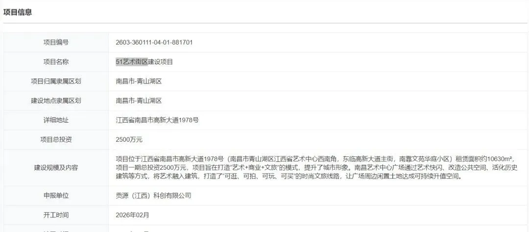 近日,南昌51艺术街区建设项目备案,项目编号2603-360111-04-01-881701。