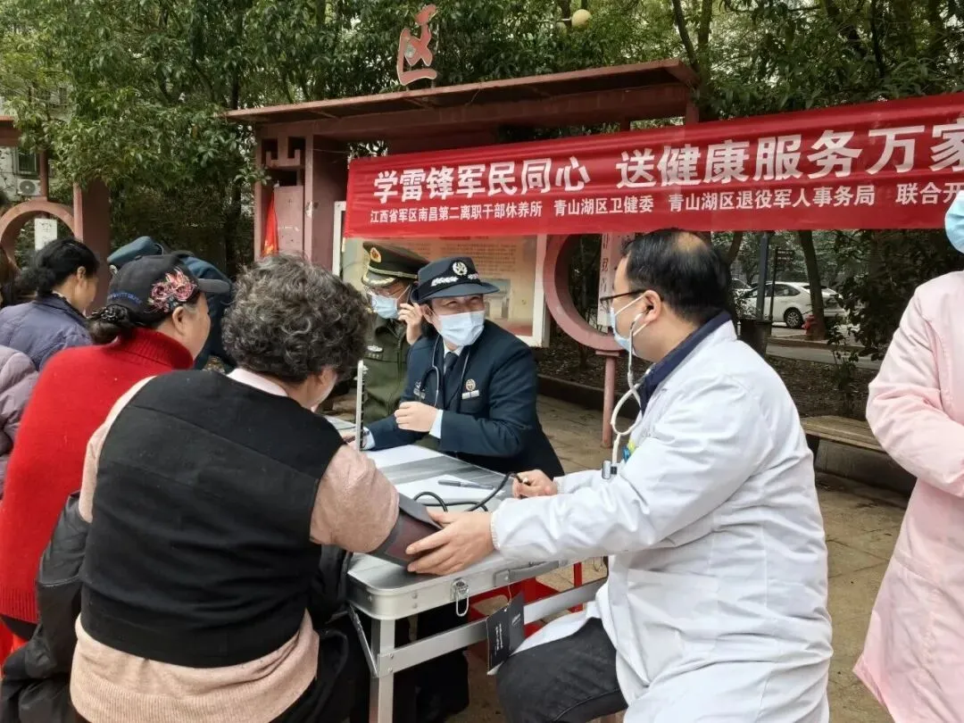 3月5日,青山湖区退役军人事务局联合相关单位,走进青山湖社区、京九社区,开展“学雷锋・送健康”联合义诊志愿服务。医护人员为退役军人和居民提供健康检测、诊疗咨询等服务,耐心问诊、普及健康知识,以温暖服务传递关爱,将优质医疗服务送到群众家门口,以实际行动践行雷锋精神。