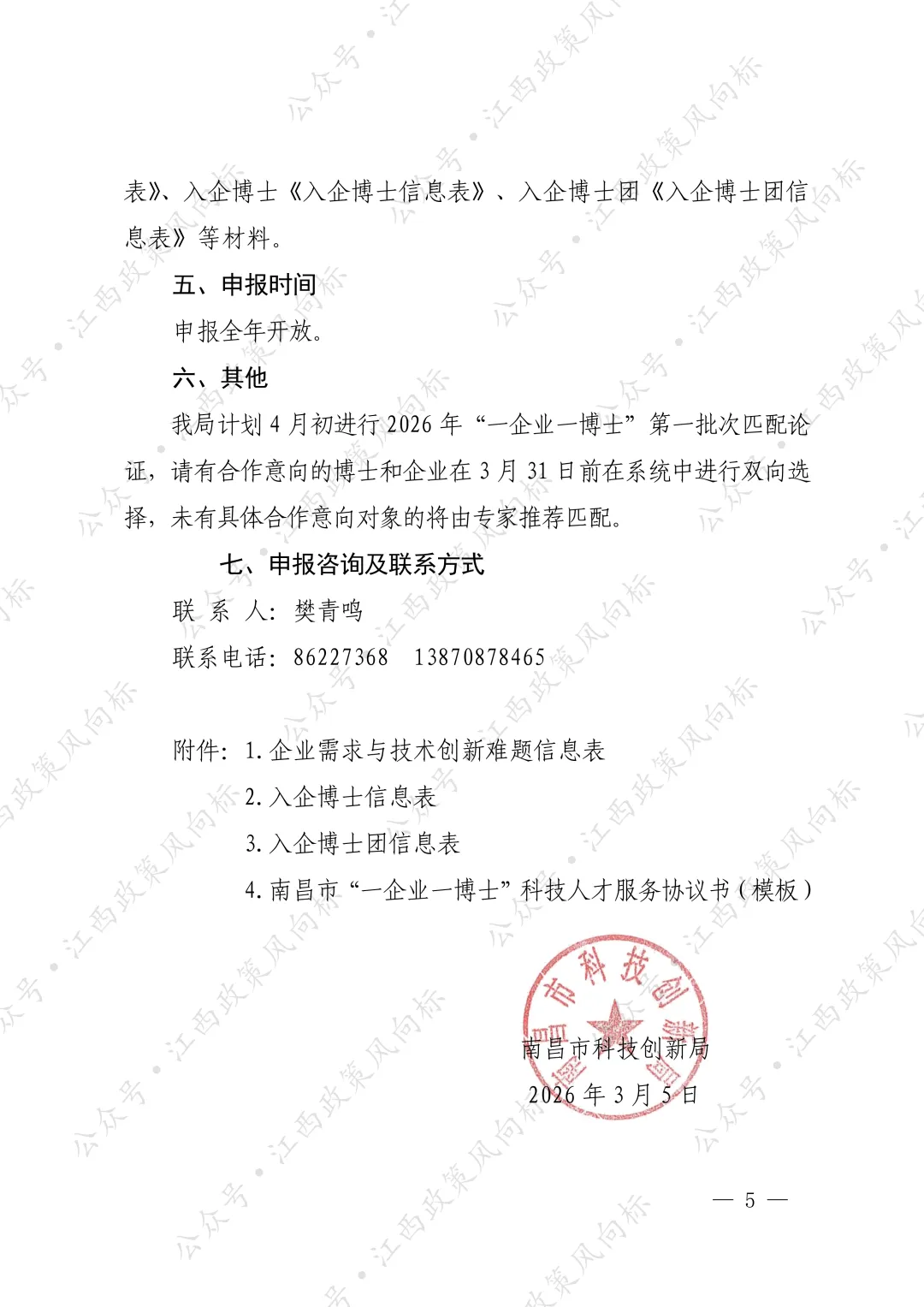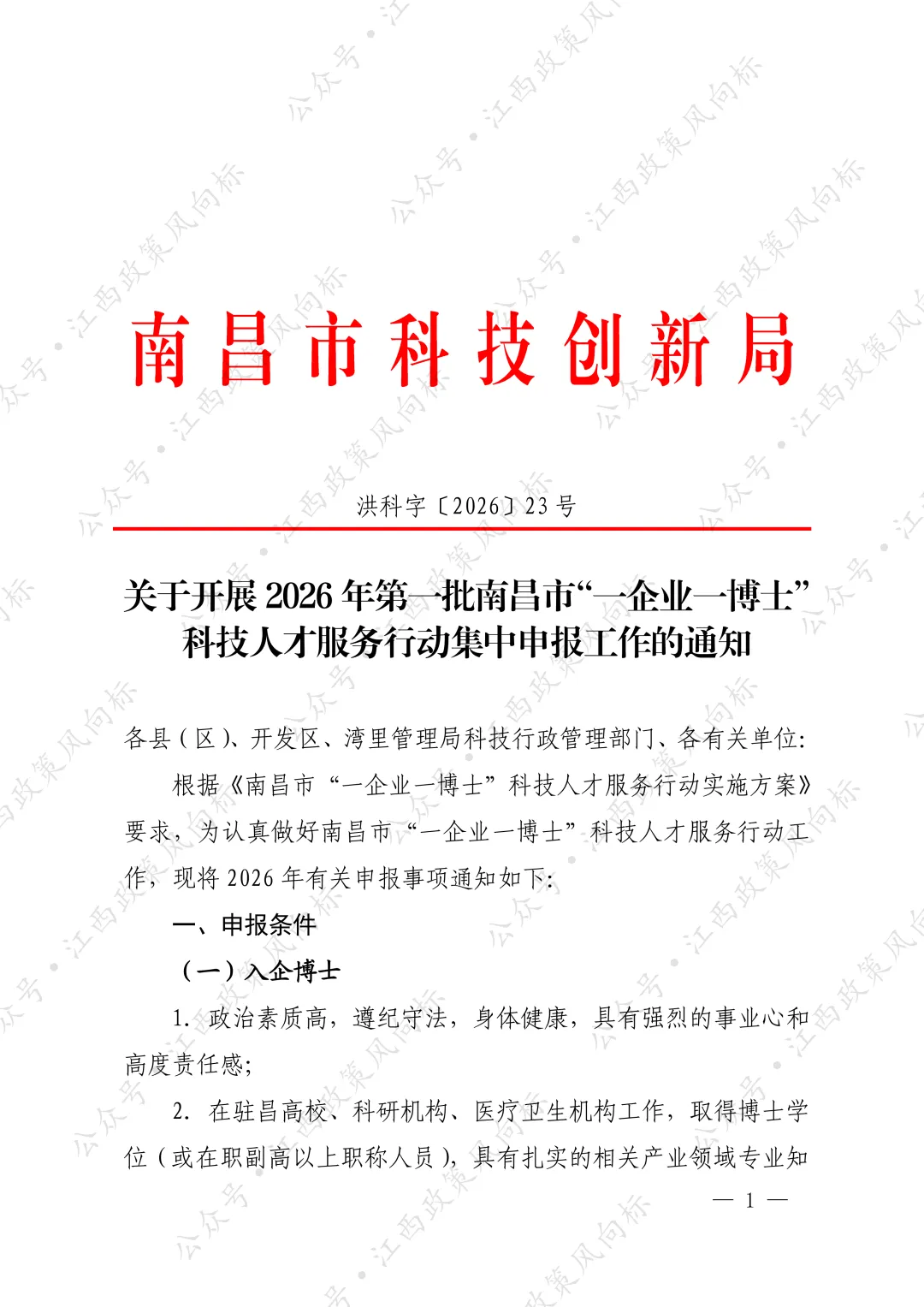根据《南昌市“一企业一博士”科技人才服务行动实施方案》要求,为认真做好南昌市“一企业一博士”科技人才服务行动工作,现将 2026 年有关申报事项通知如下。
