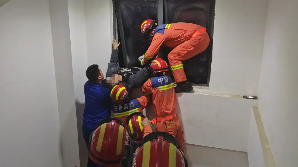 男子因腿部旧伤未愈,无法发力,独自挣扎了三个多小时仍未能脱困,直到有居民前来取快递发现异常,才帮忙报警求助。