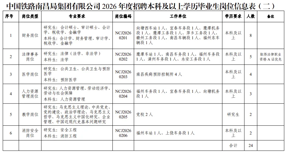 24人!中国铁路南昌局集团有限公司2026年度招聘本科及以上学历毕业生公告(二)