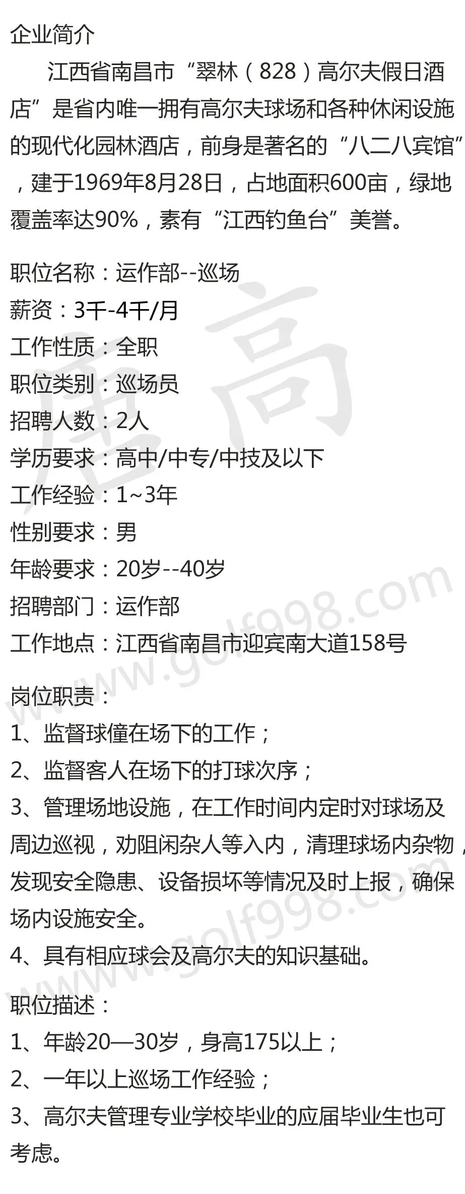 >【聘】运作部-巡场 南昌翠林高尔夫俱乐部