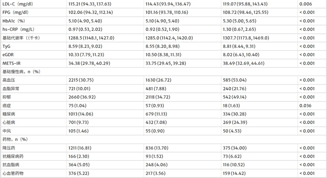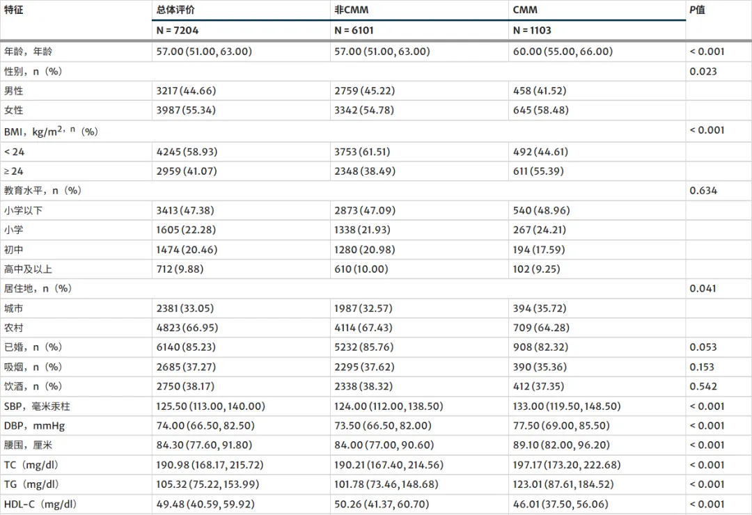 ▷本研究 7204 人随访 9 年,15.3% 发 CMM。CMM 组年龄更大、代谢及慢病指标更差,TyG、METS-IR、BMR 更高、eGDR 更低(均 P<0.05)。表1