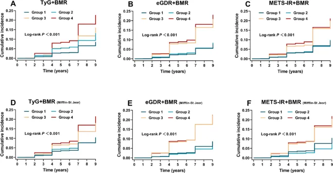 图2:按介入代指标水平和基础代谢率(A-F)分层的 CMM 累计发生率的 Kaplan–Meier 曲线。