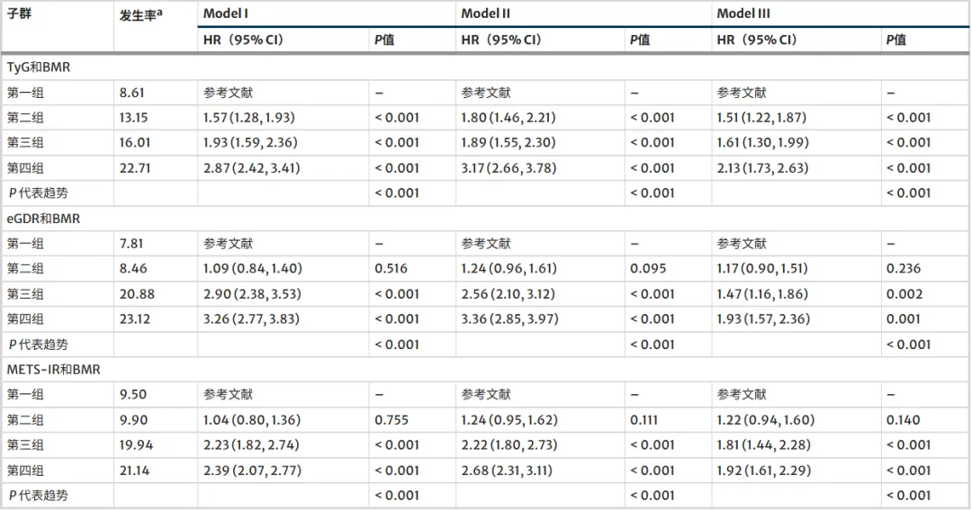 TyG、eGDR、MES-IR和BMR与发生CMM风险的关联▷校正后 BMR、TyG、METS-IR 升高增 CMM 风险,eGDR 升高则降低;高 IR + 高 BMR 发病率最高,Cox 回归证实该组合风险显著升高,敏感性分析验证关联稳健(METS-IR 除外)。图2、表2
