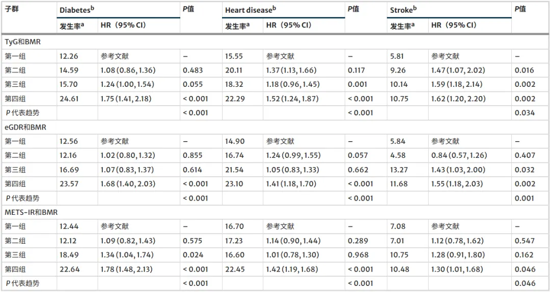 表3: 介入放射替代指标与基础代谢率(BMR)对糖尿病、心脏病和中风风险联合影响的敏感性分析(n = 5237)。