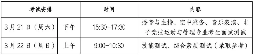 2.报考播音与主持、空中乘务、音乐表演、电子竞技运动与管理四个专业的考生,按专业面试测试成绩占60%、技能测试成绩占40%的比例计算技能校考成绩。