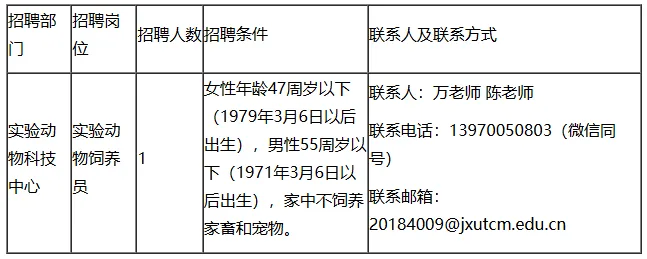 因工作需要,江西中医药大学实验动物科技中心公开招聘实验动物饲养员1名,具体条件如下: