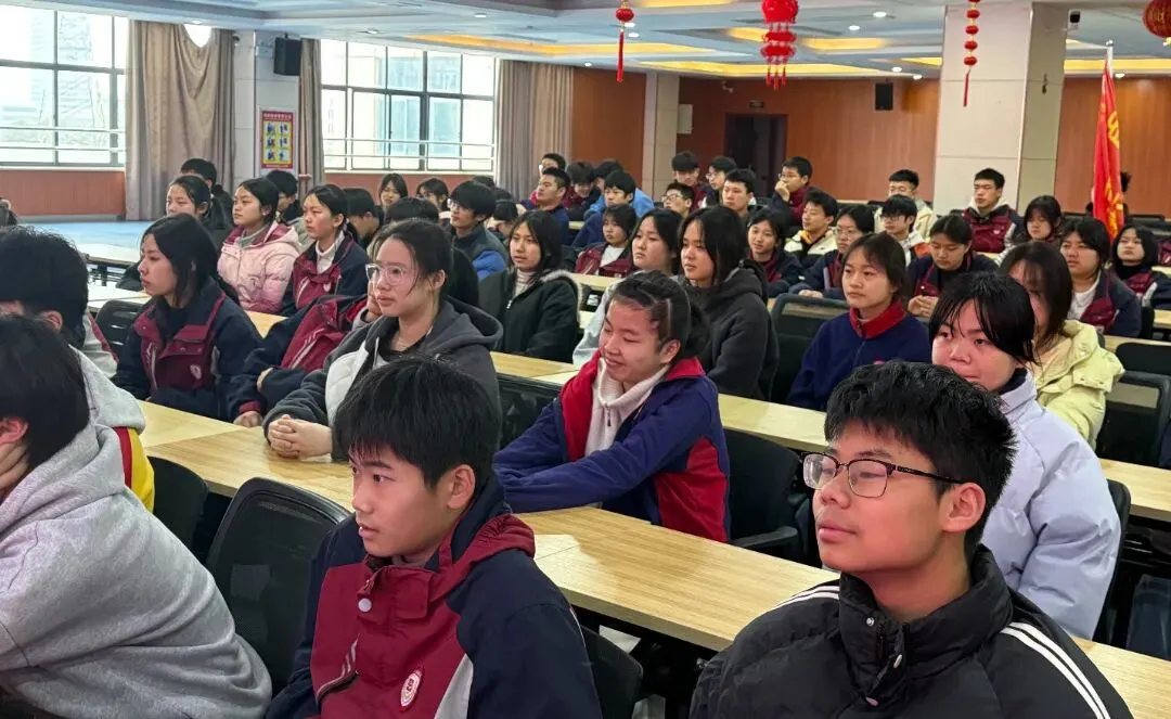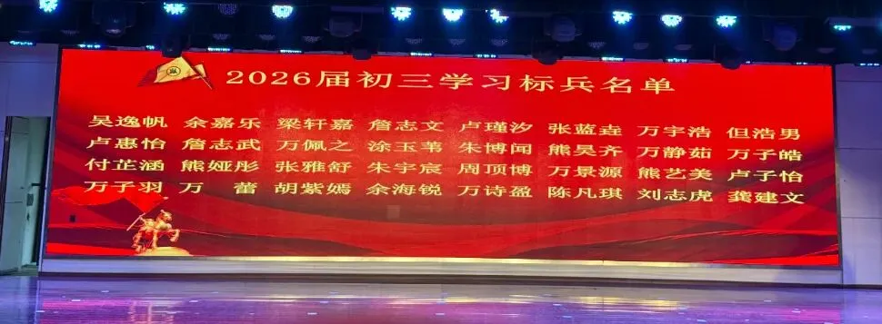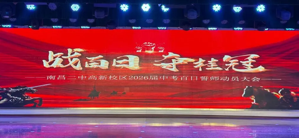 春潮涌动催奋进,百日鏖战铸辉煌。2026年3月9日,南昌二中高新校区渊冲楼三楼大礼堂内旌旗猎猎、士气如虹,学校2026届中考百日誓师大会隆重举行。学校领导、初三年级全体师生及家长代表齐聚一堂,为第一届从一年级到九年级在学校“土生土长”的学子吹响中考百日冲刺的冲锋号角,共同定格这场热血澎湃的青春誓师,凝聚家校师三方力量,共赴六月荣光。