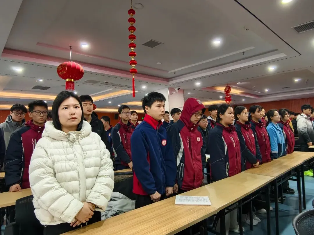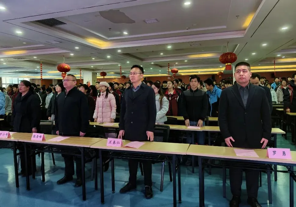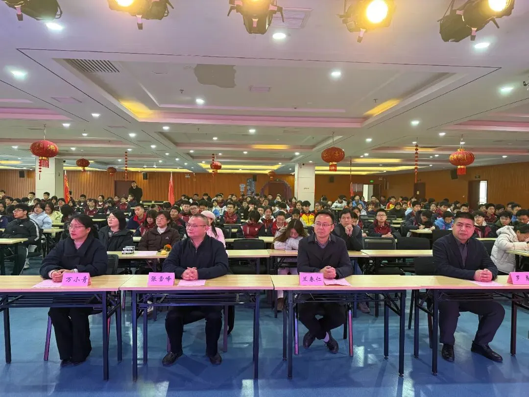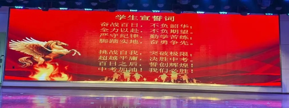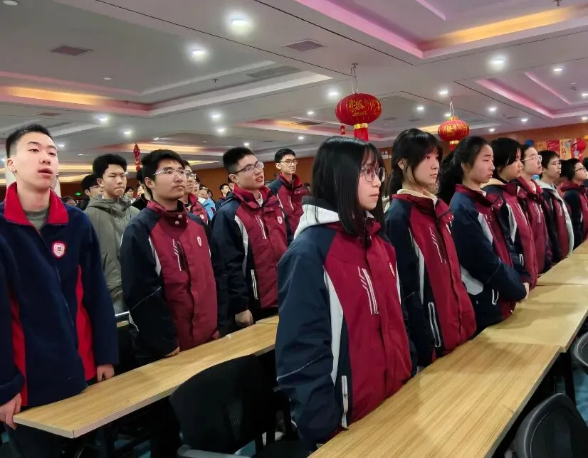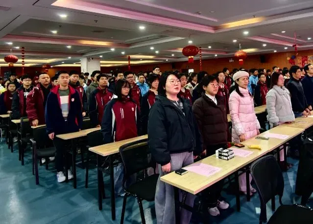 大会伊始,全体师生肃立致敬,雄壮的中华人民共和国国歌响彻礼堂,嘹亮的校歌紧随其后,在会场久久回荡。歌声里,是学子们对祖国的赤诚、对母校的热爱,更凝聚着九年寒窗磨剑、百日冲刺决胜中考的坚定信念,为整场大会奠定了庄严奋进的基调。这一刻,热血如虹,征程已启。