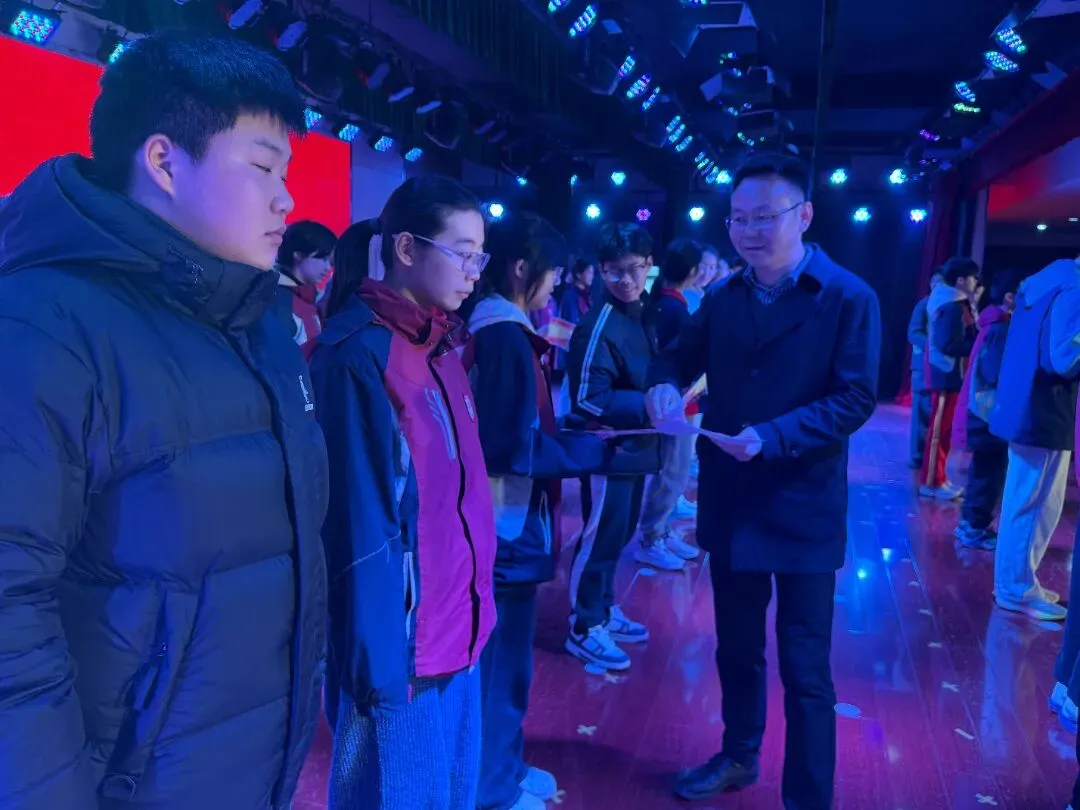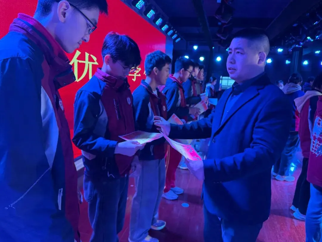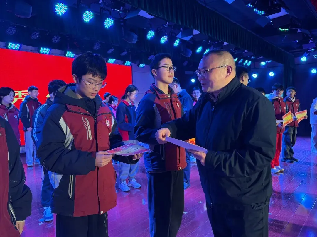 榜样引领,逐梦前行。大会特设初三学习标兵表彰环节,主持人宣读表彰决定后,学校领导为获奖学子颁发奖状。这份荣誉,是对优秀学子们过往不懈努力的肯定与嘉奖,更是对全体初三同学的激励与鼓舞,让在场学子深知,榜样就在身边,拼搏方能致远,进一步点燃了大家争先创优、奋力冲刺的备考热情。