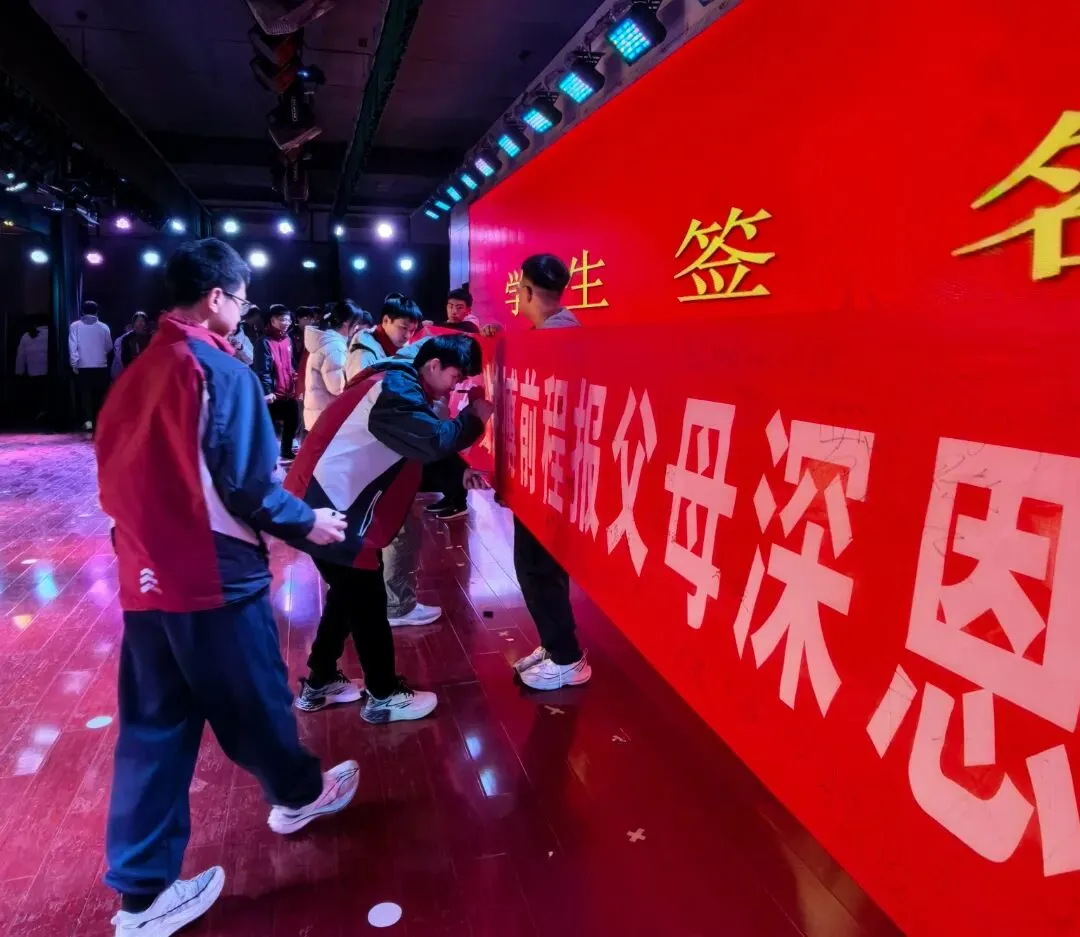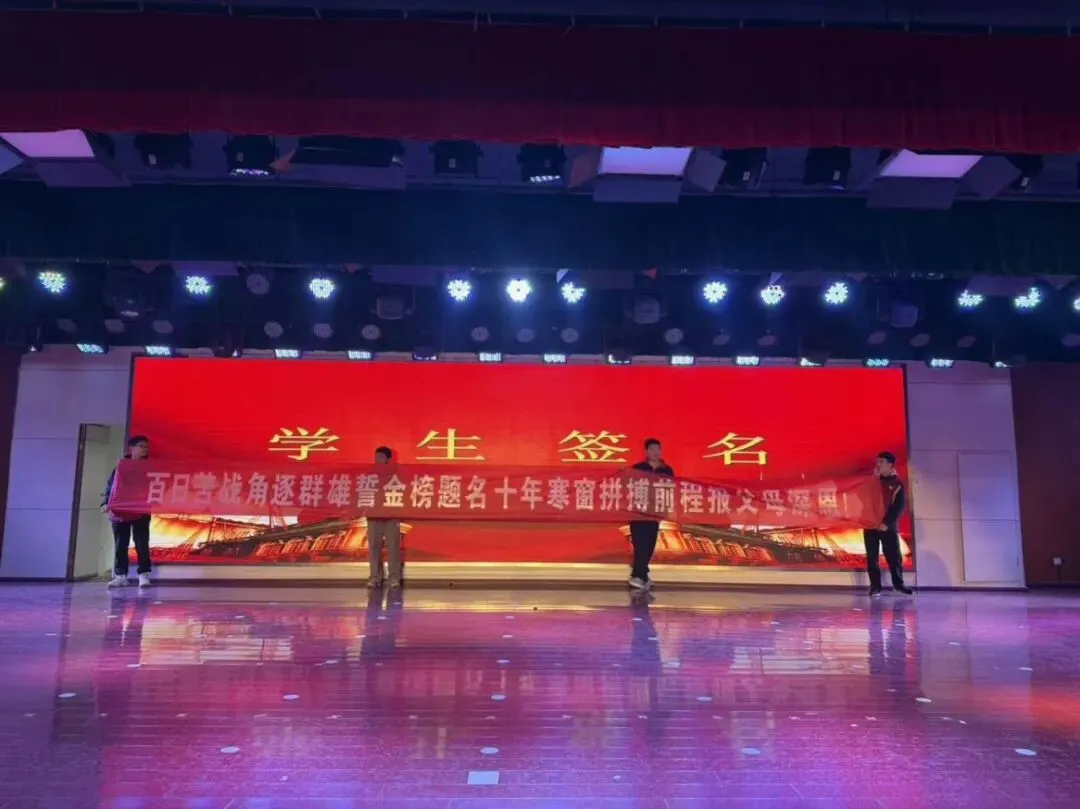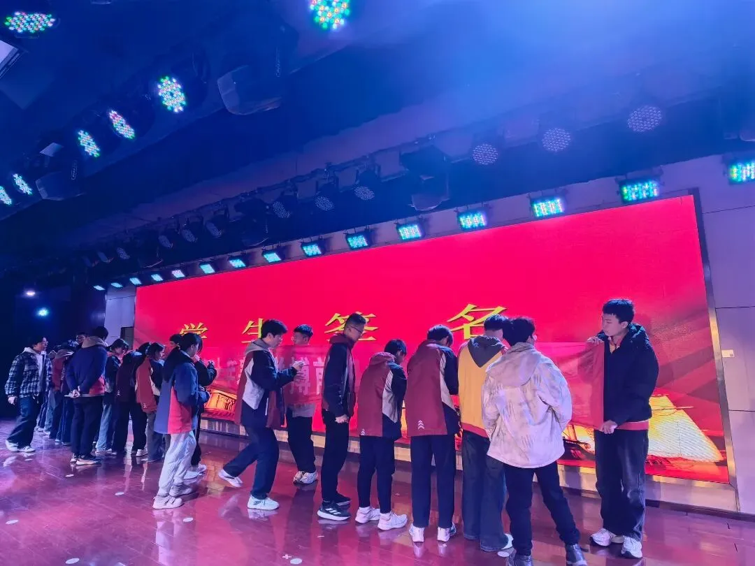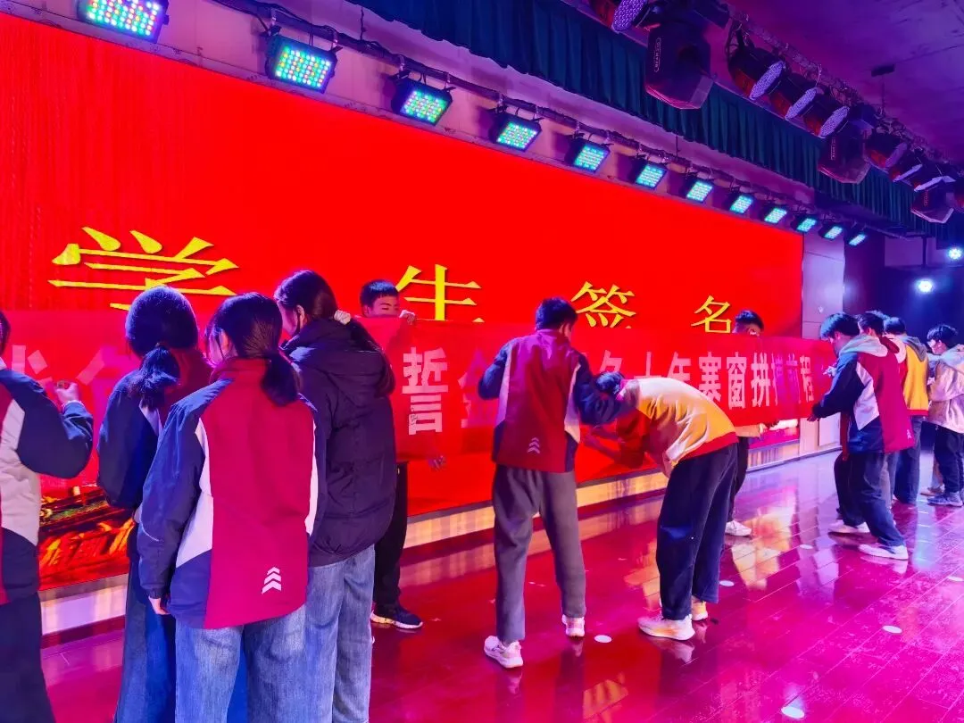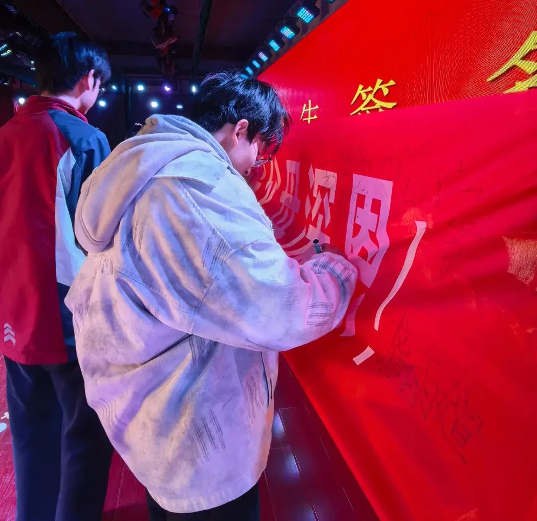 一笔一划,皆是承诺;一撇一捺,俱是担当。宣誓结束后,学生签名仪式正式开启,各班学子有序登台,在“中考百日誓师”主题横幅上郑重签下自己的名字。每一个签名,都是一份对百日冲刺的坚定承诺,更是一份对美好未来的热切期许,将九年寒窗的坚守、百日拼搏的信念深深镌刻,凝聚成逐梦前行的磅礴力量。