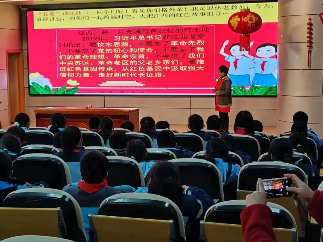 本次活动紧扣 “五老话江西” 特色宣讲要求,特邀 “‘五老’话江西” 思政精品课一等奖获得者、区 “五老” 关爱报告团成员聂苏珉担任主讲。聂苏珉以《清贫的力量,血写的忠诚——方志敏革命故事》为核心,结合江西红色热土的革命底蕴、革命先辈的奋斗历程与新时代家乡的发展成就,采用故事讲述、课件展示、互动问答相结合的方式,让宣讲更具代入感与感染力。活动现场还组织老少共诵《可爱的中国》经典节选,让红色经典浸润童心,赣鄱精神根植心底。本次活动共有 80 余名师生代表、区 “五老” 关爱报告团成员、社区志愿者及学生家长代表参与,多方联动、同堂共学,营造出浓厚的红色育人氛围。