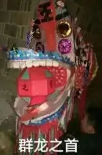 图:南昌新建区西山镇的纸扎灯灯头,顶部写有“王”字。龙嘴通常含龙珠或龙球(新式则为火球),龙耳通常以莲花灯花瓣做装饰,龙须则为彩带,有黄色,蓝色、绿色、红色等。